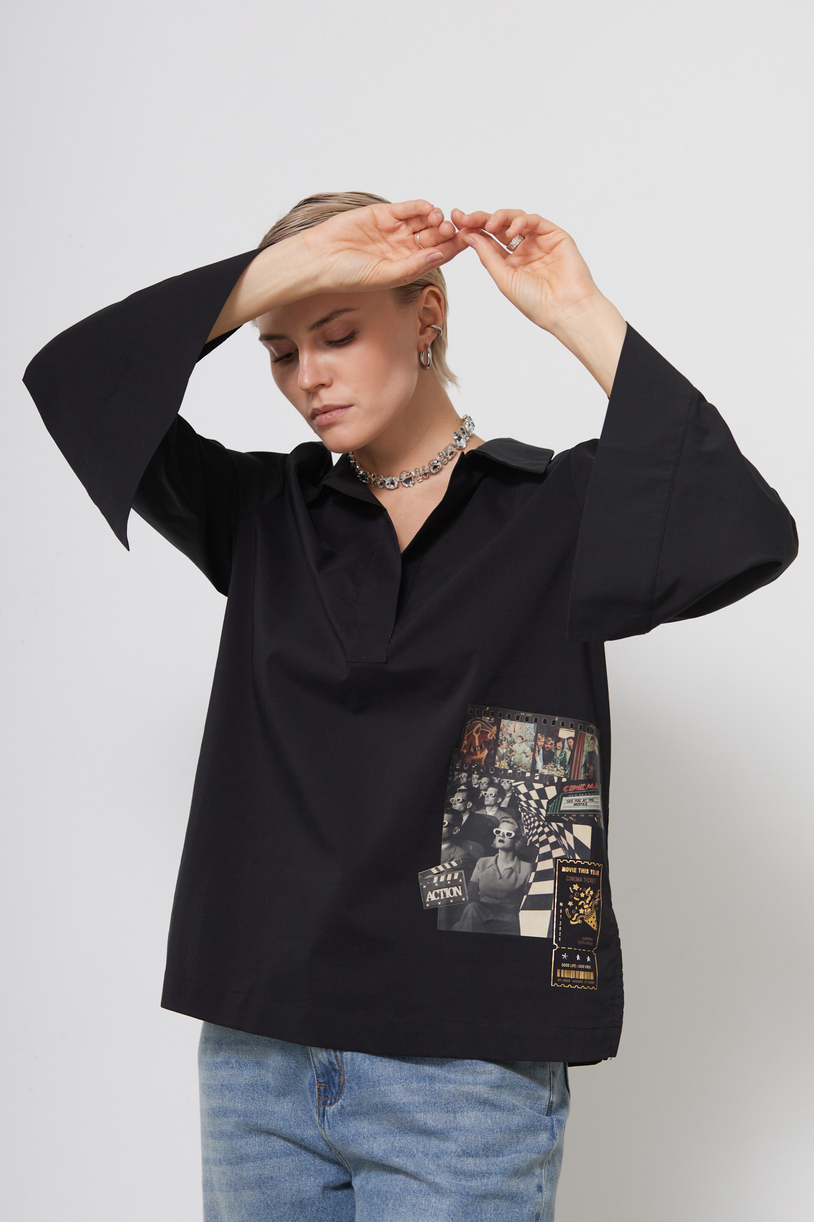 Рубашка oversize из гладкого хлопка с печатным принтом и разрезами на рукавах.