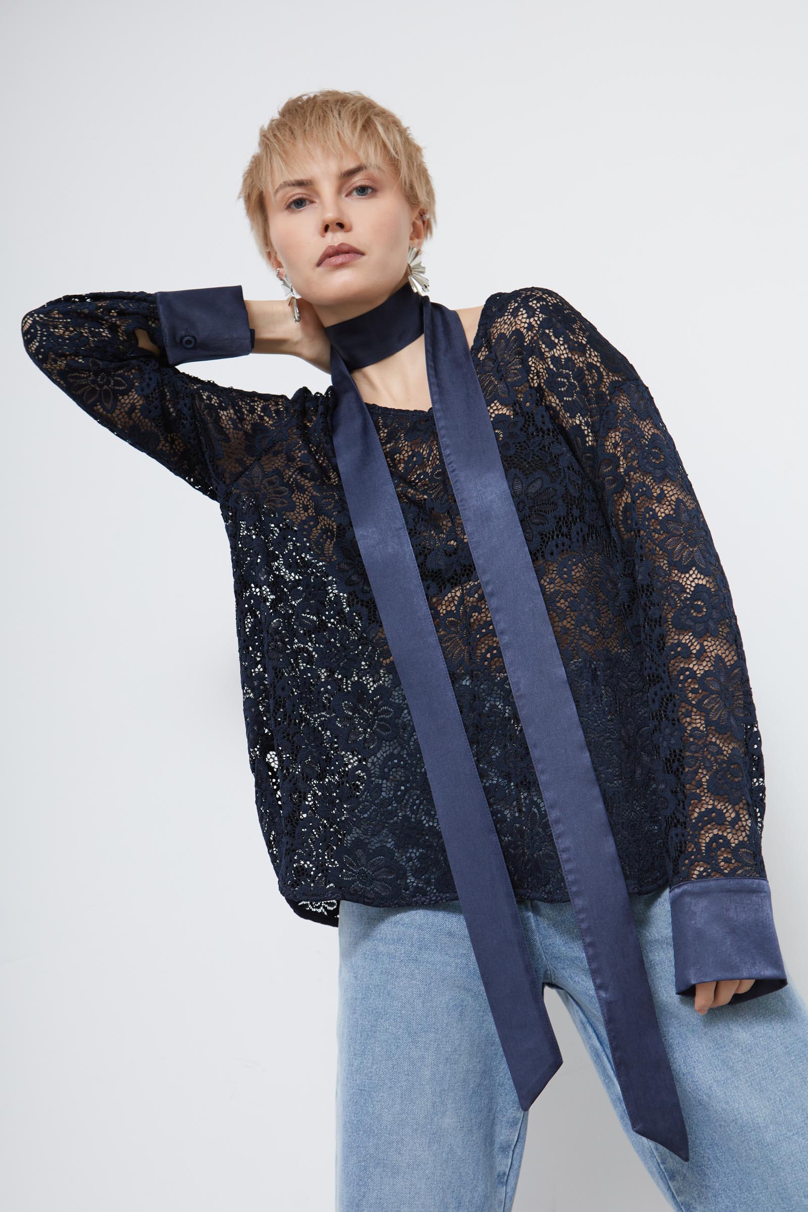 Блузка oversize из полупрозрачного кружева с декоративной атласной лентой в комплекте.
