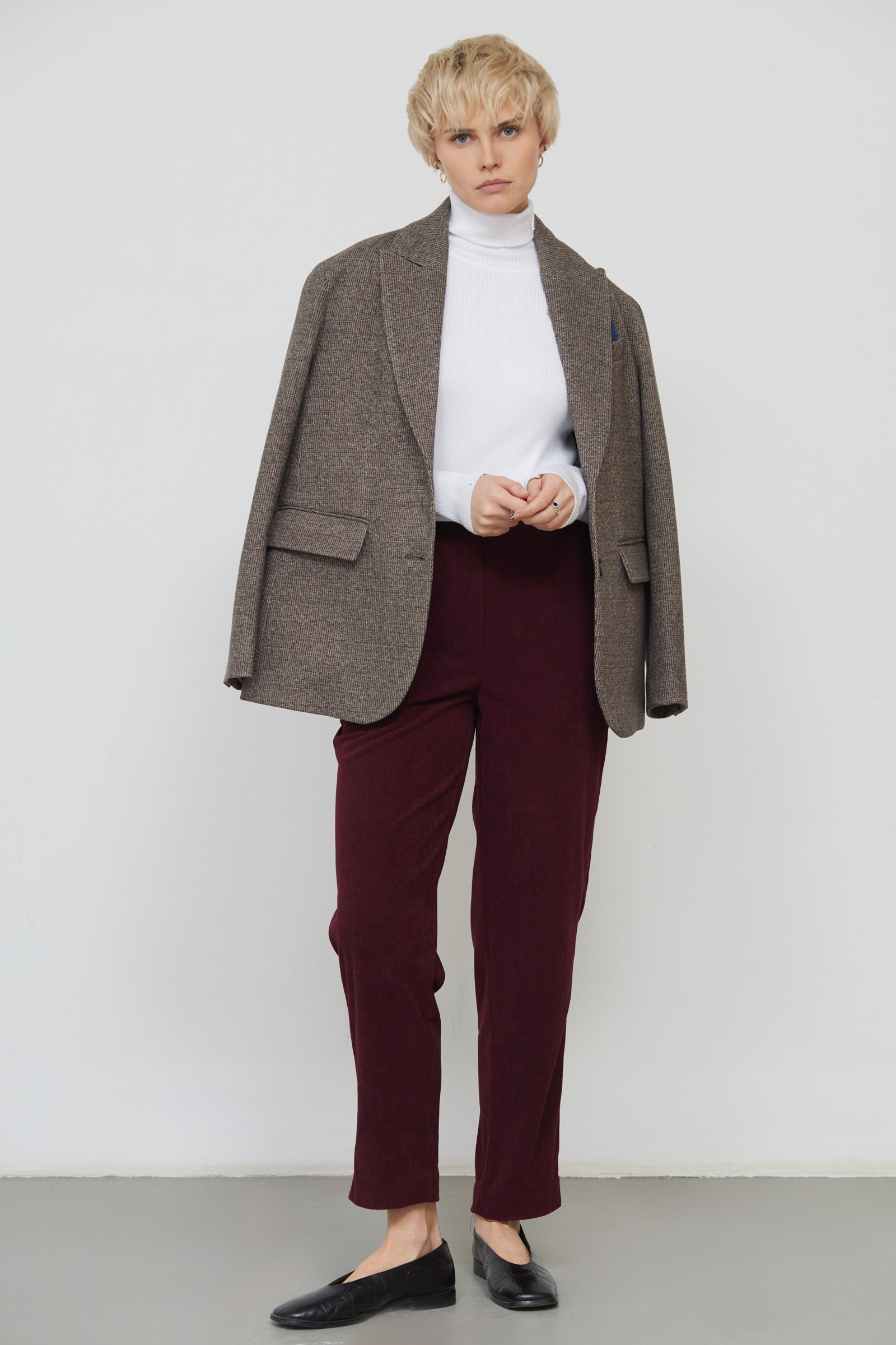 Слегка зауженные брюки из микровельвета.