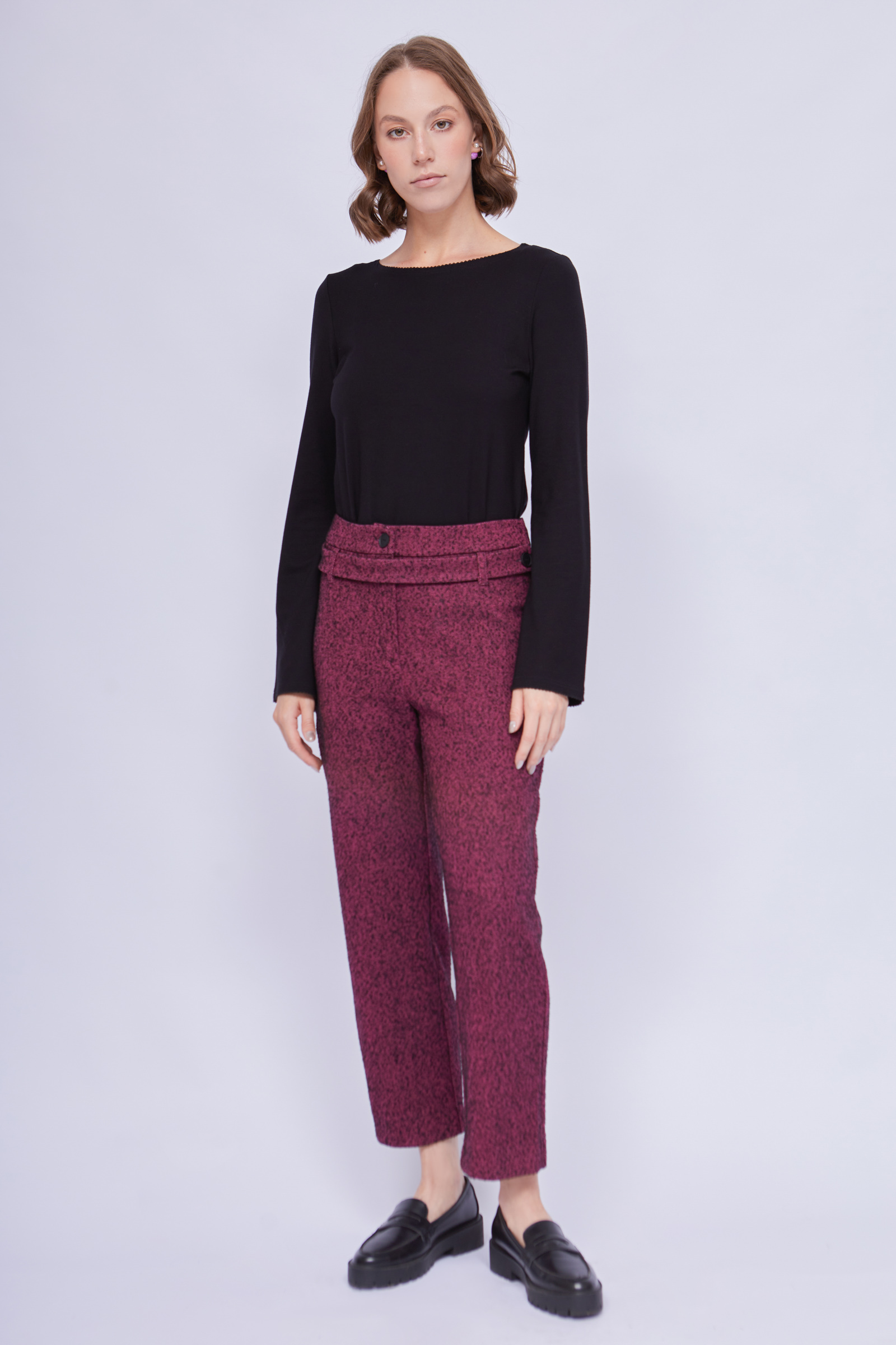 Укороченные брюки из буклированной ткани с декоративным поясом.