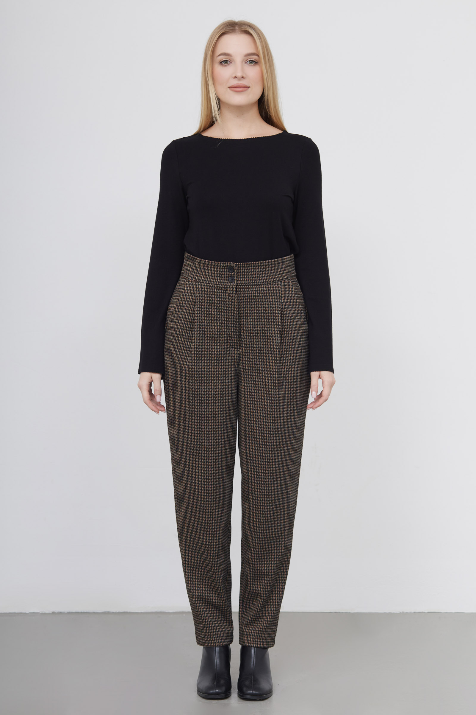 Брюки-бананы из мягкой фланелевой ткани с контрастным рисунком, защипами и широким поясом.