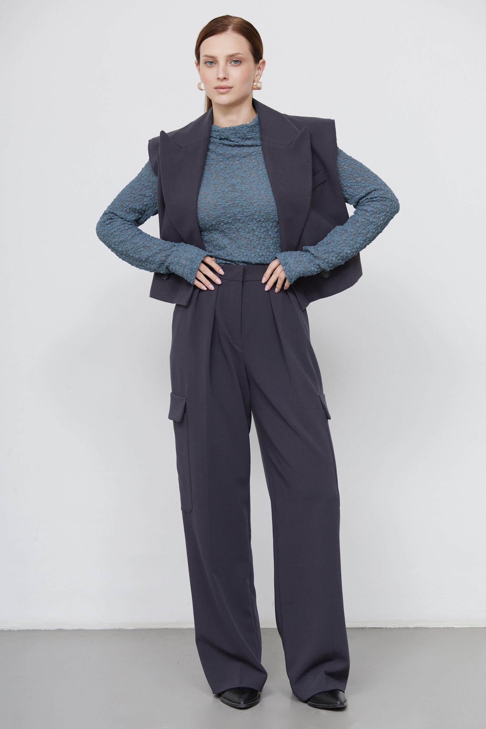 Широкие костюмные брюки карго со стрелками и складками спереди.