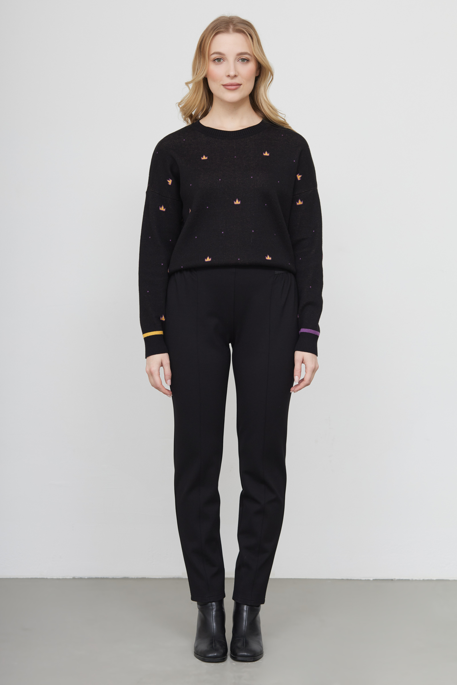 Зауженные утепленные брюки на эластичном поясе.