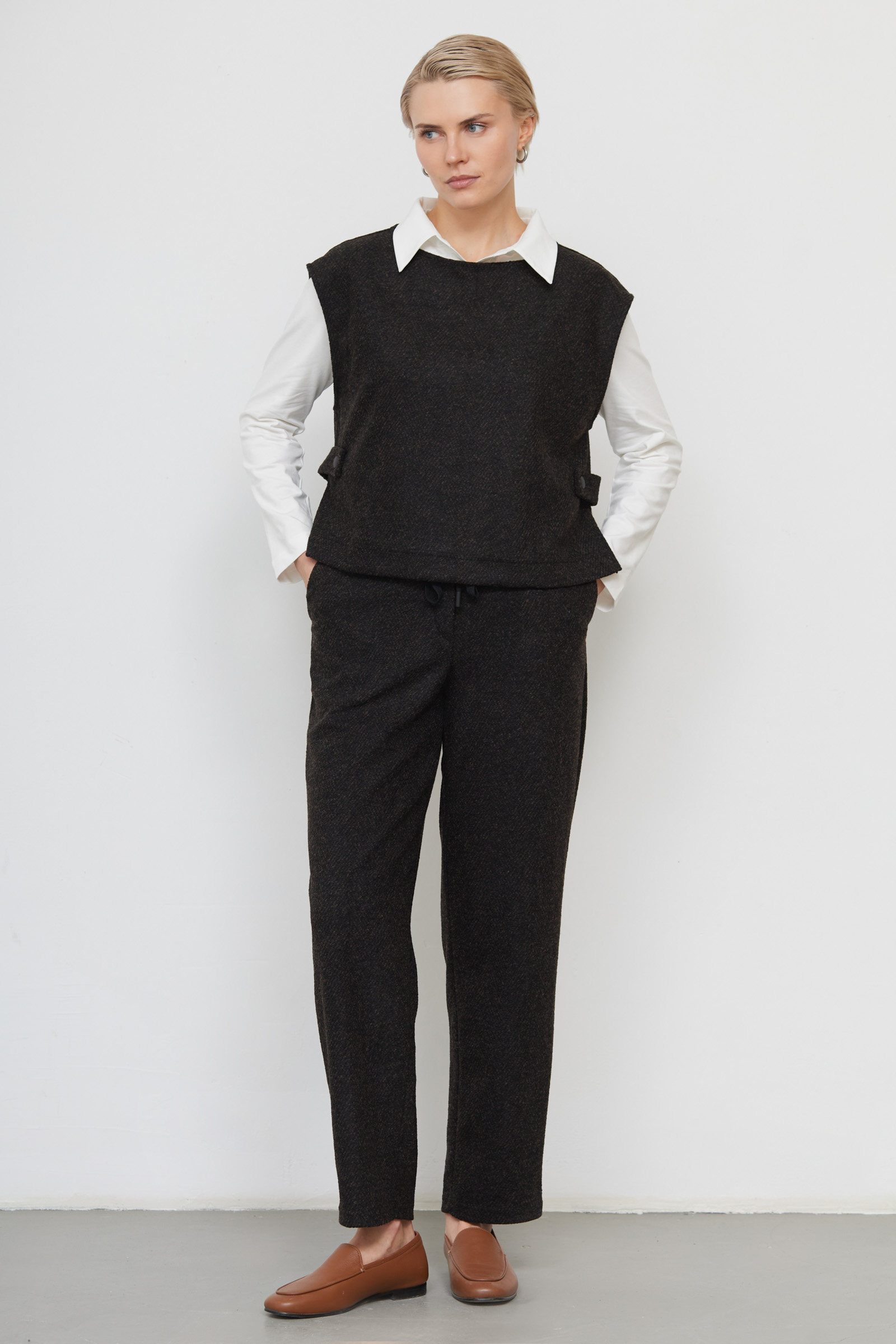 Слегка зауженные брюки из костюмной ткани в елочку на эластичном поясе с кулиской.