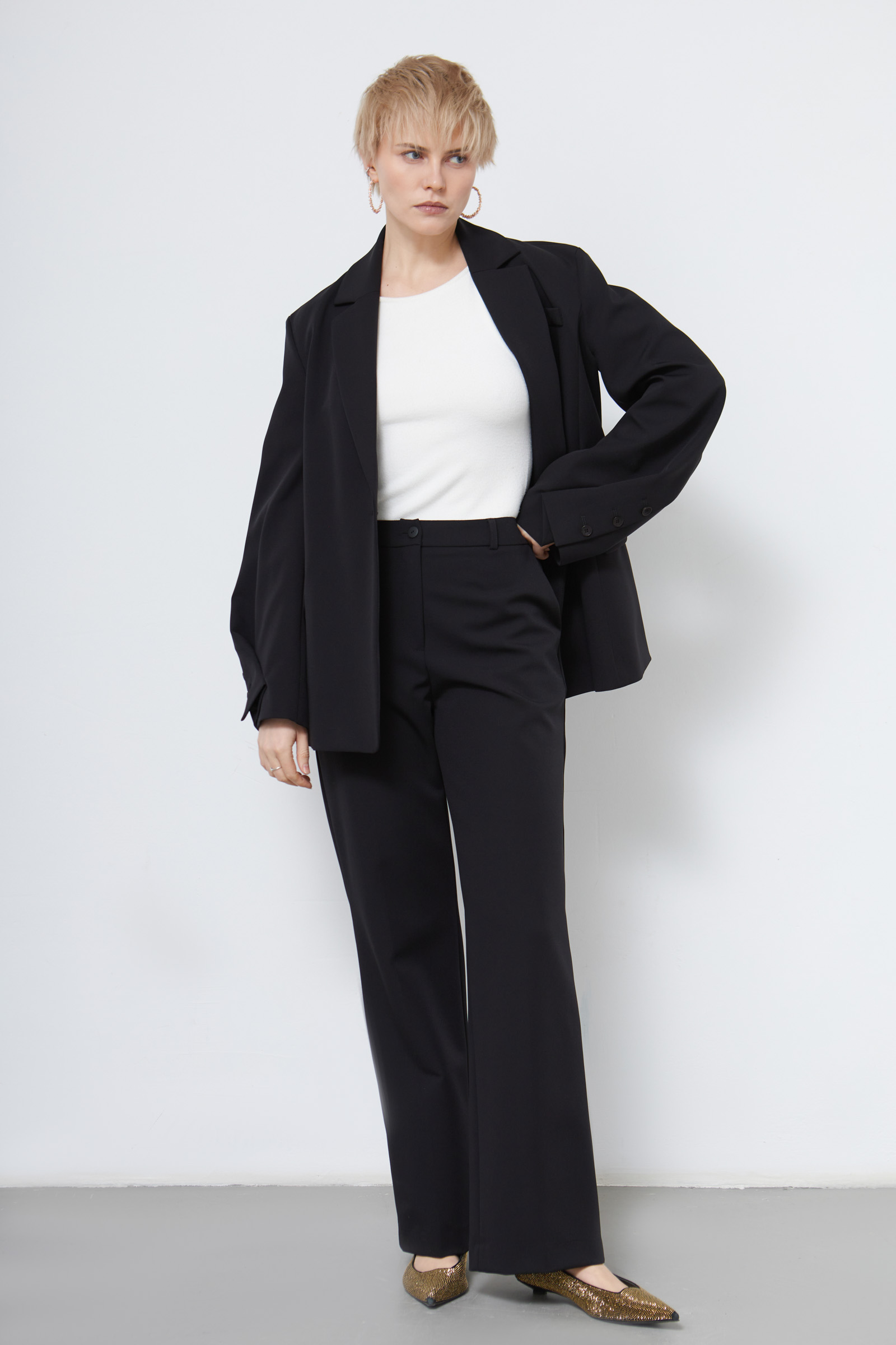 Классические костюмные брюки с разрезами сзади по низу.