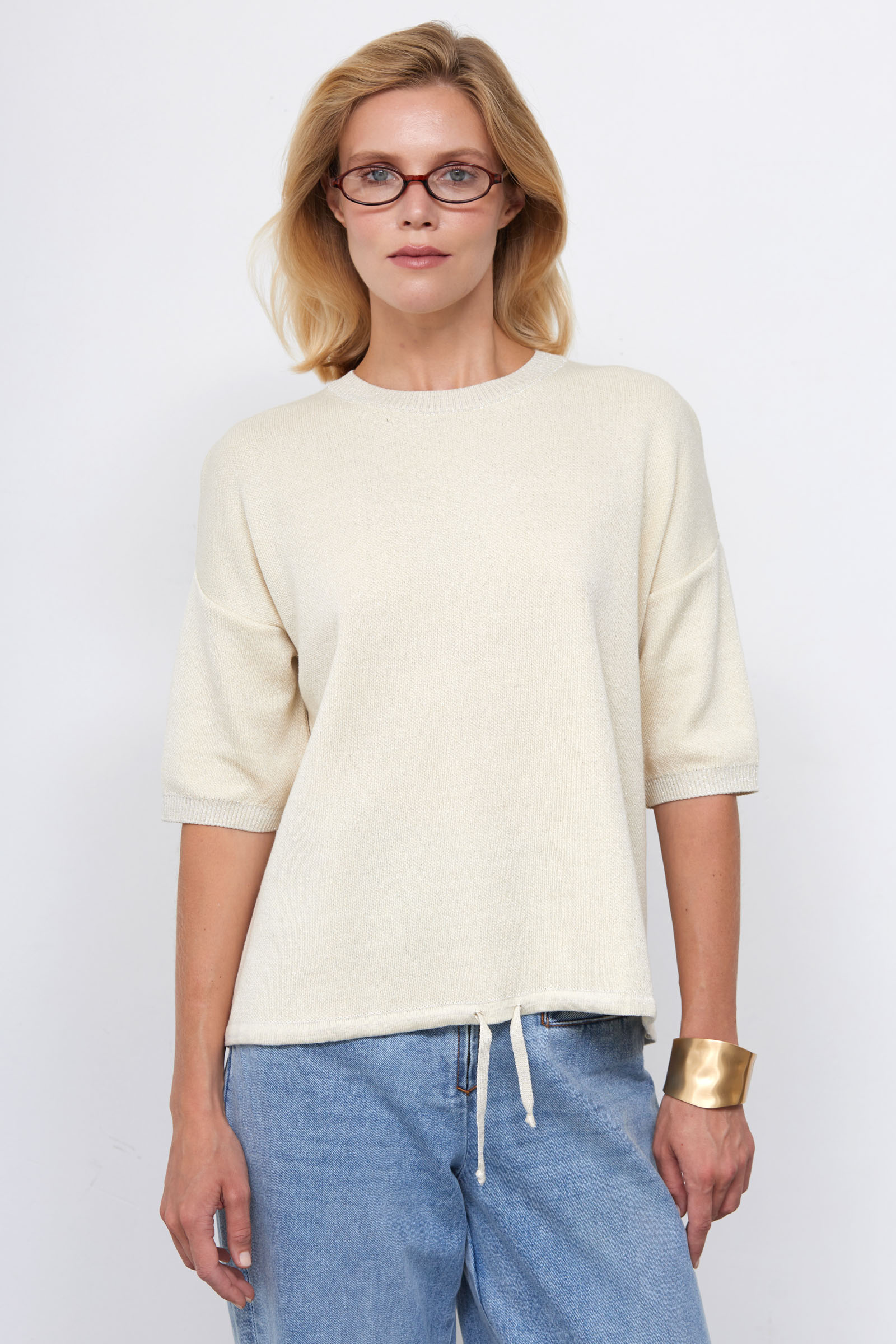 Джемпер из тонкого вязаного трикотажа с люрексом и короткими рукавами.