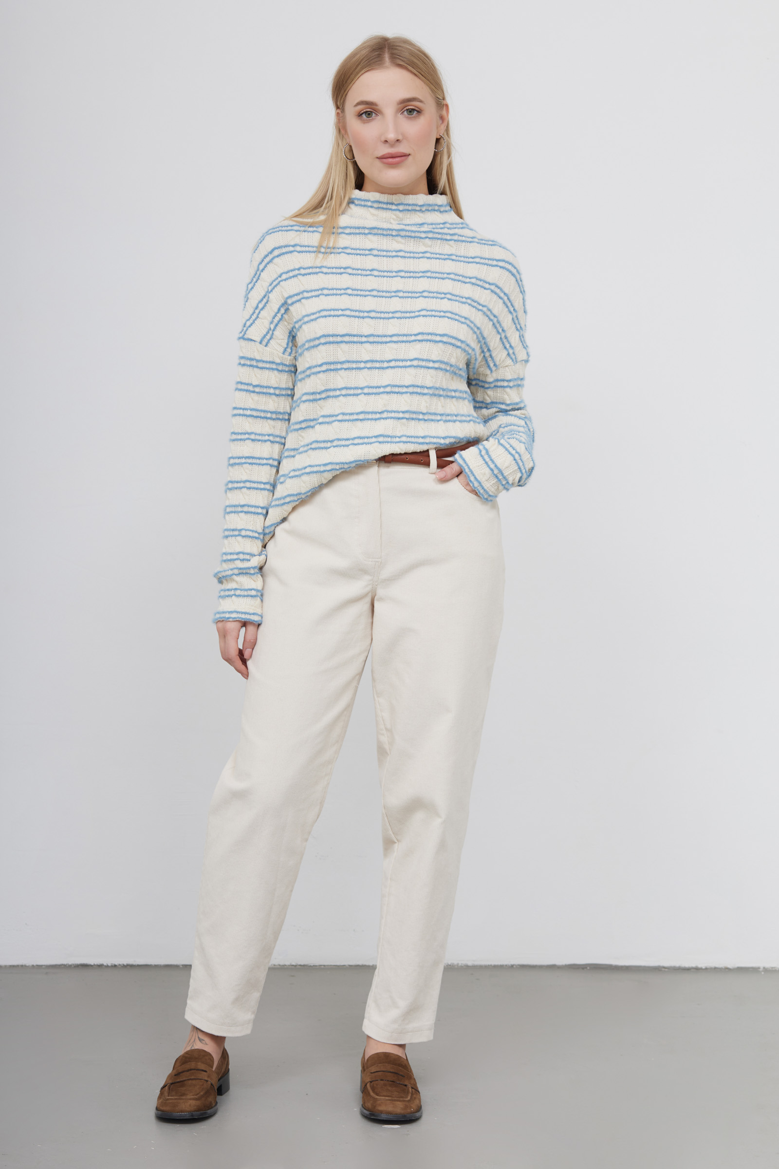 Джемпер из мягкого фактурного трикотажа в полоску с цельнокроеным воротником.