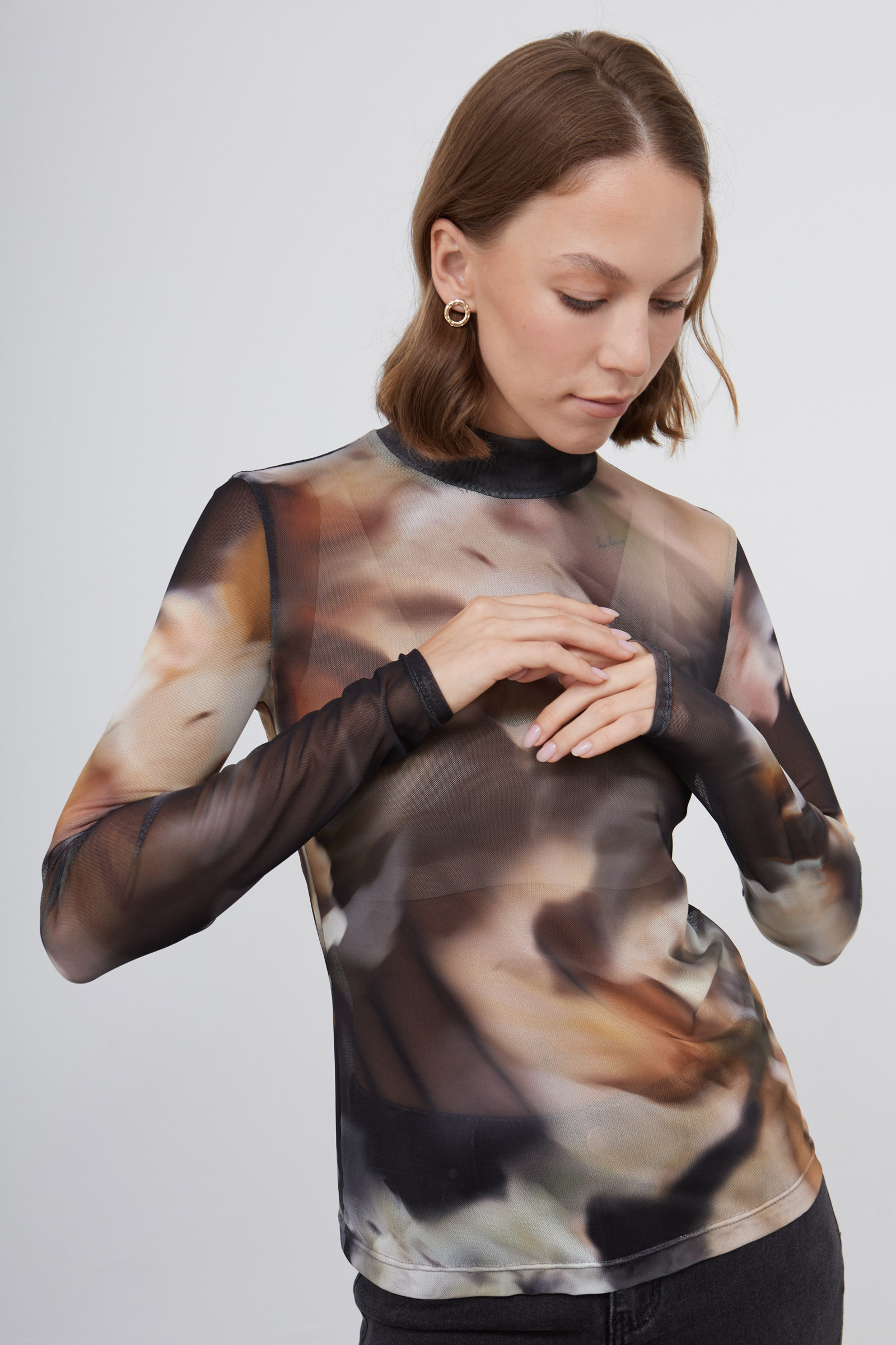 Водолазка из тонкой эластичной сетки с абстрактным принтом.