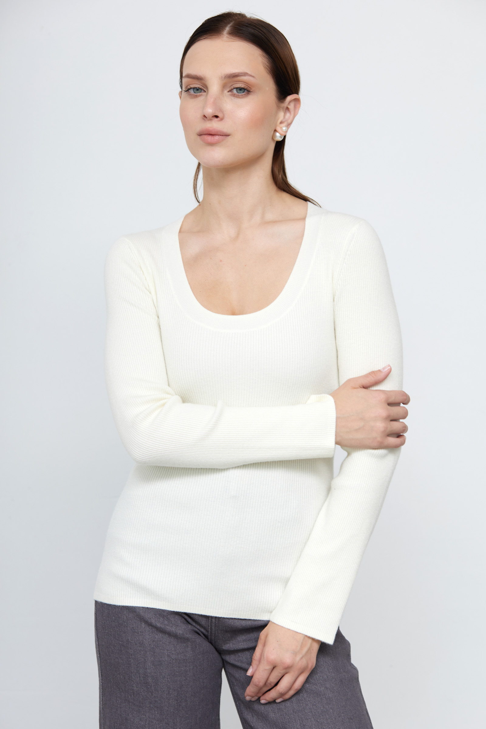 Базовый облегающий джемпер из мягкого вязаного трикотажа в рубчик с добавлением вискозы и шерсти.