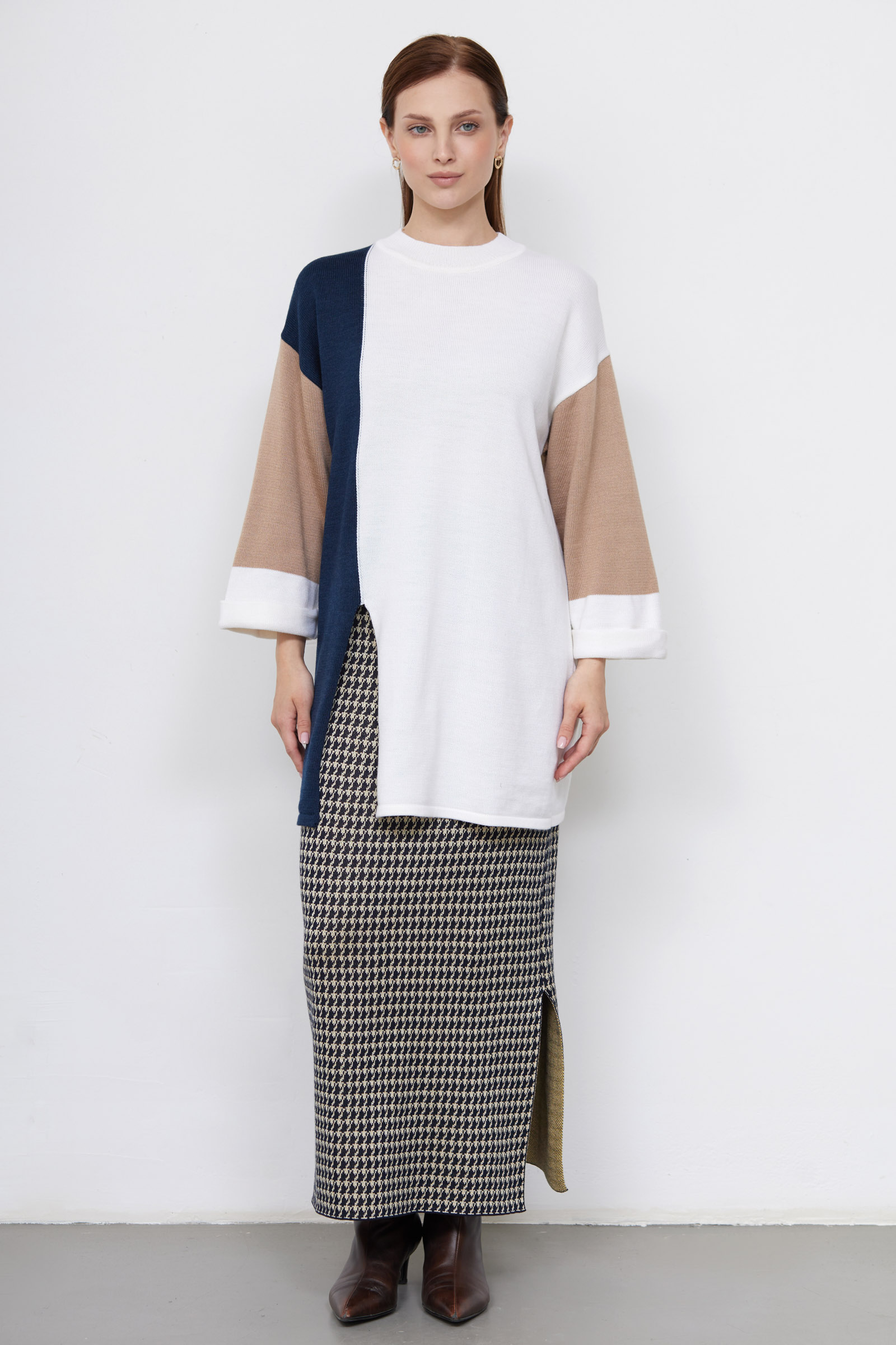 Удлиненный джемпер в стиле колор-блок из мягкого вязаного трикотажа с шерстью и разрезом спереди.