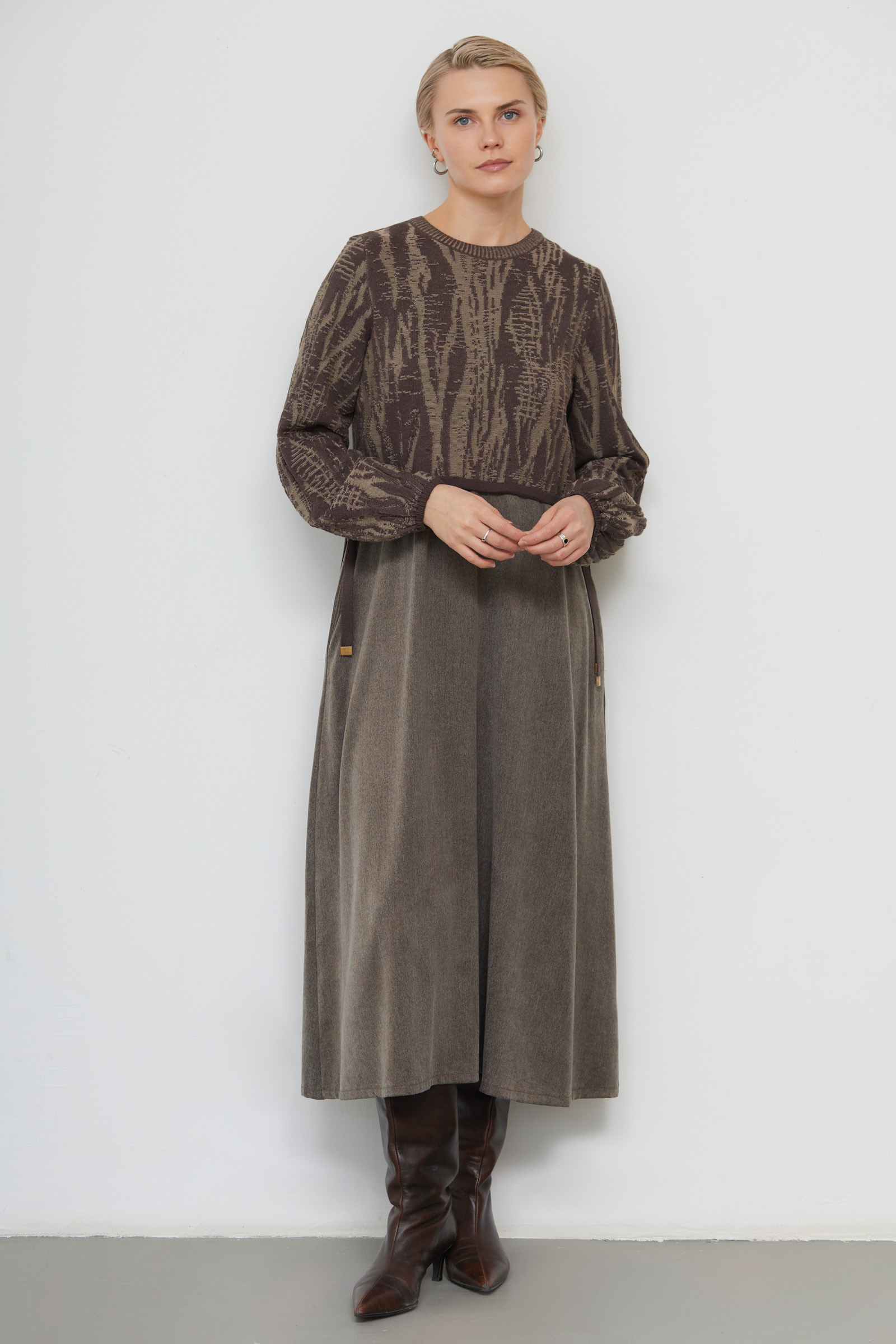 Комбинированное платье с верхей частью из трикотажа жаккардовой вязки и юбкой из смесовой вискозы.