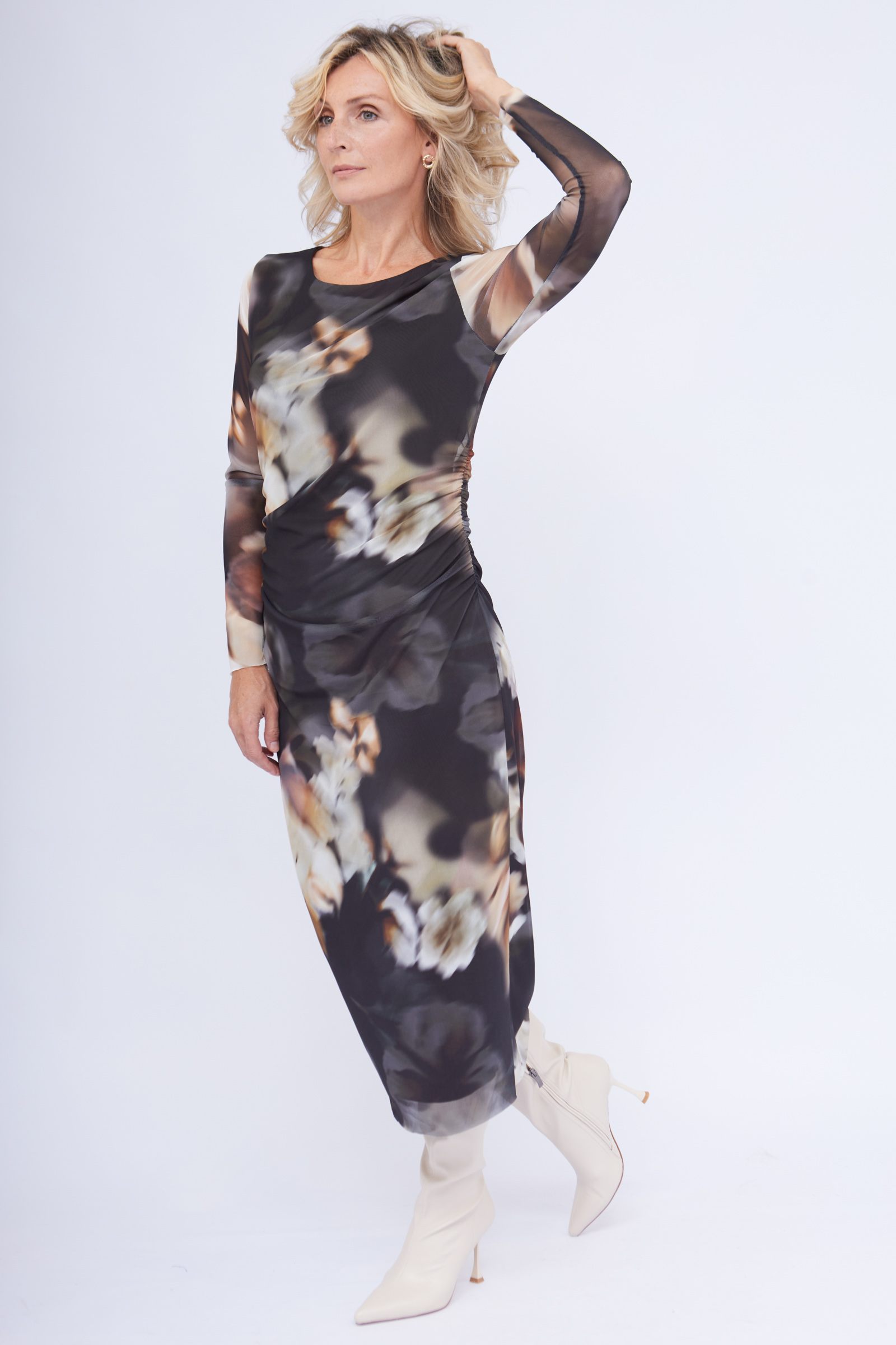 Облегающее платье из сетки с абстрактным принтом и драпировкой.