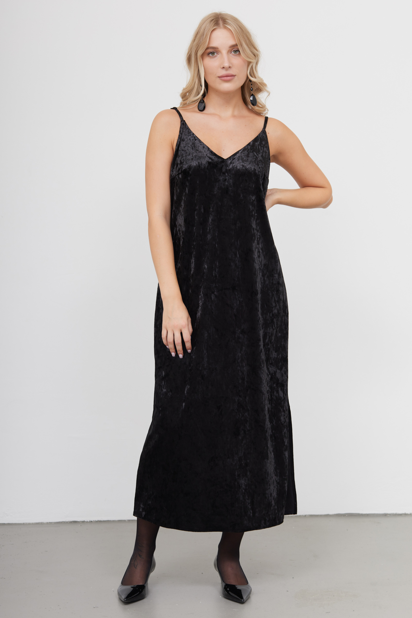Длинное бархатное платье на тонких бретелях.