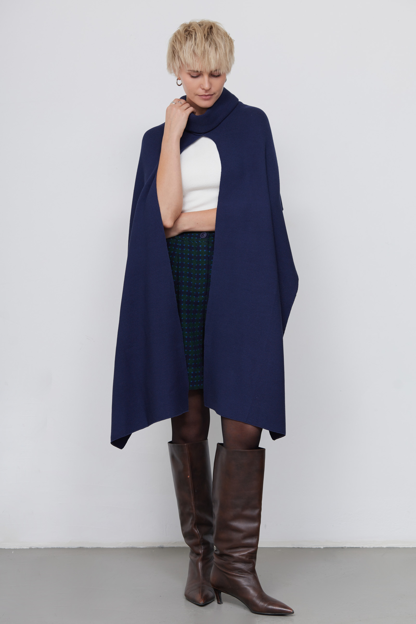 Длинный шарф-накидка с высоким воротником из мягкого вязаного трикотажа.