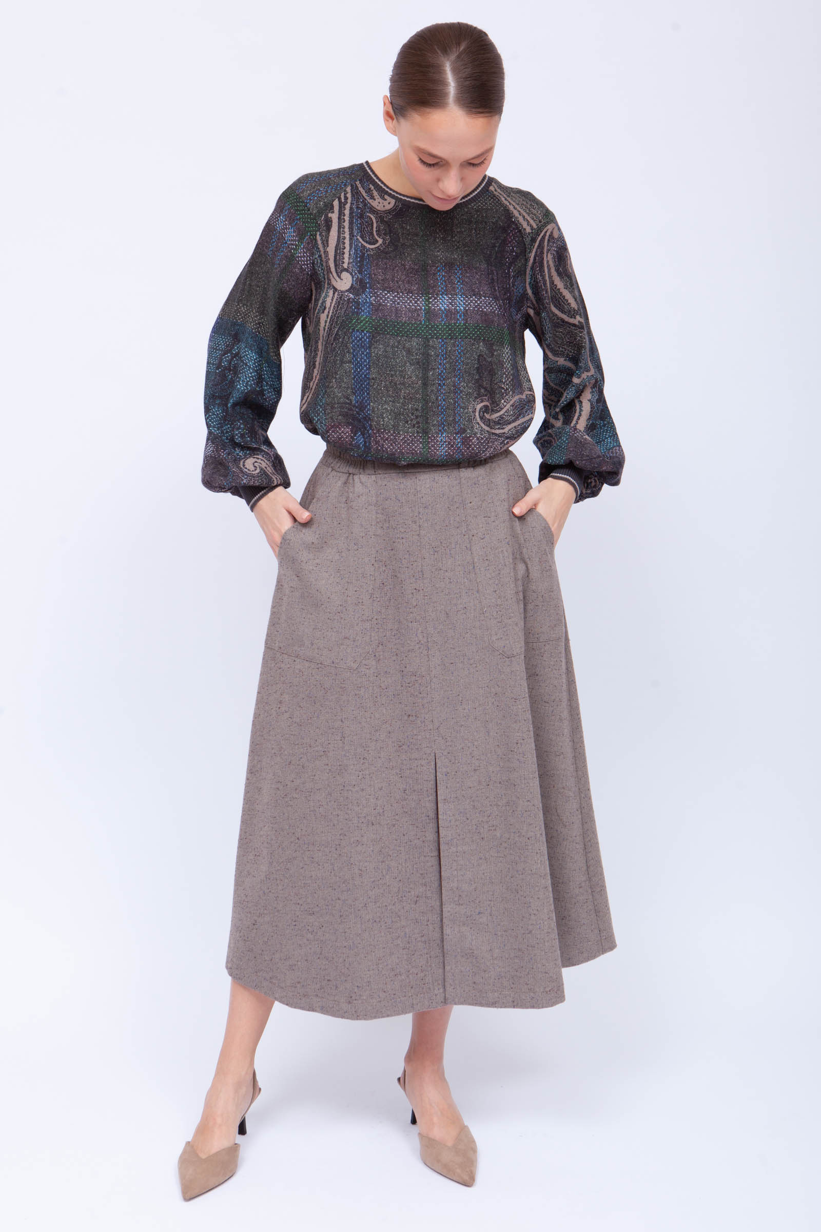 Юбка из поливискозы с цветными вкраплениями, на эластичном поясе, с разрезом.