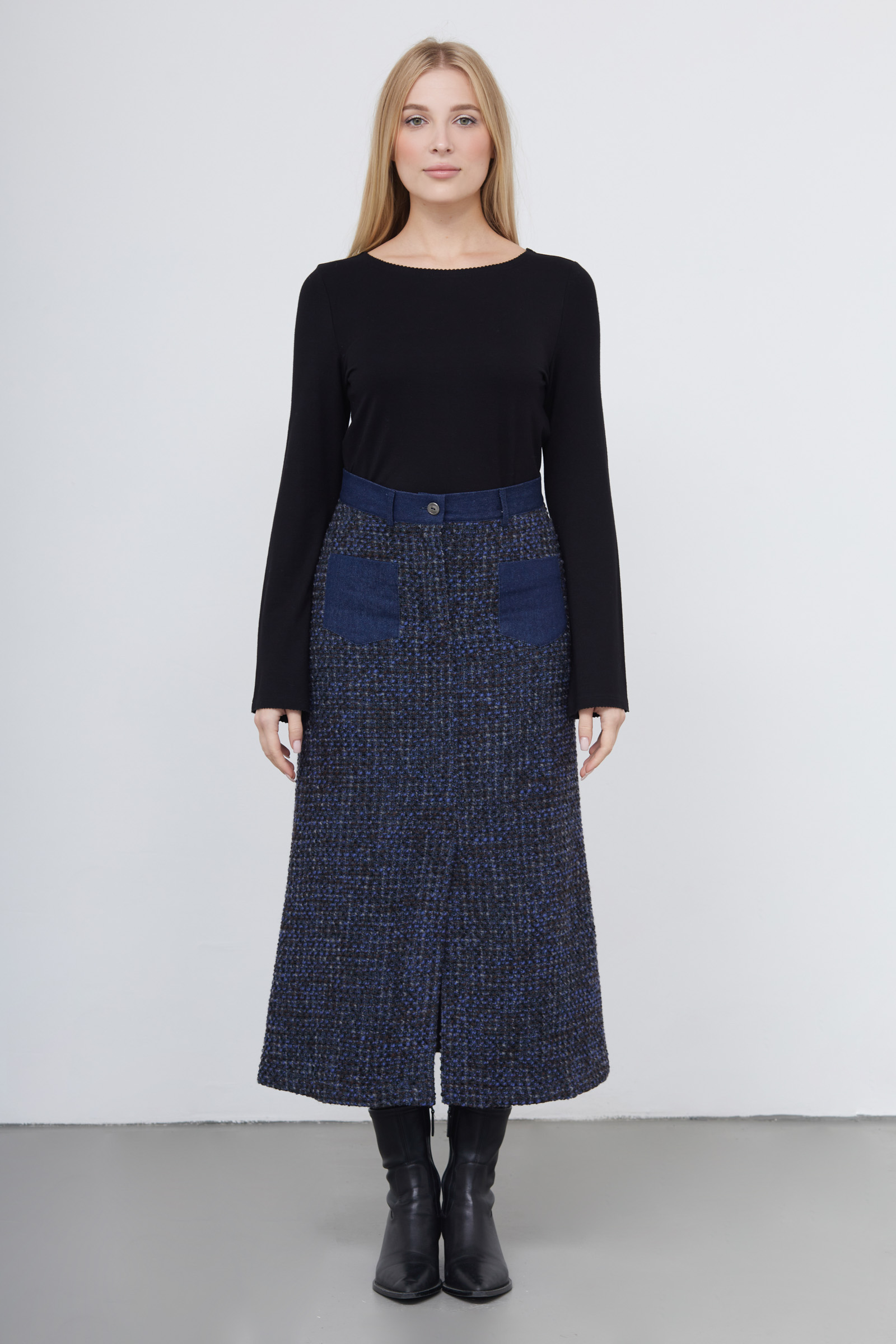 Буклированная юбка миди из полушерсти с деталями из денима.