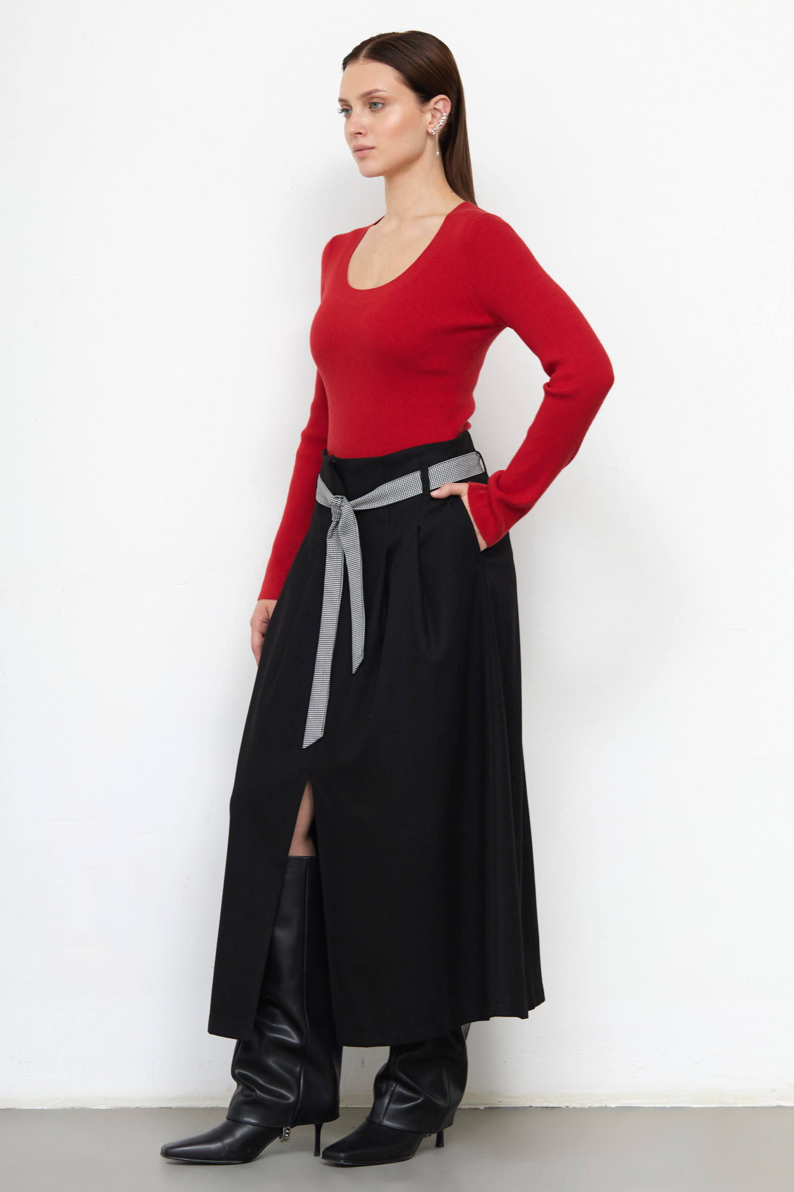 Юбка из костюмной ткани с разрезом и контрастным поясом.