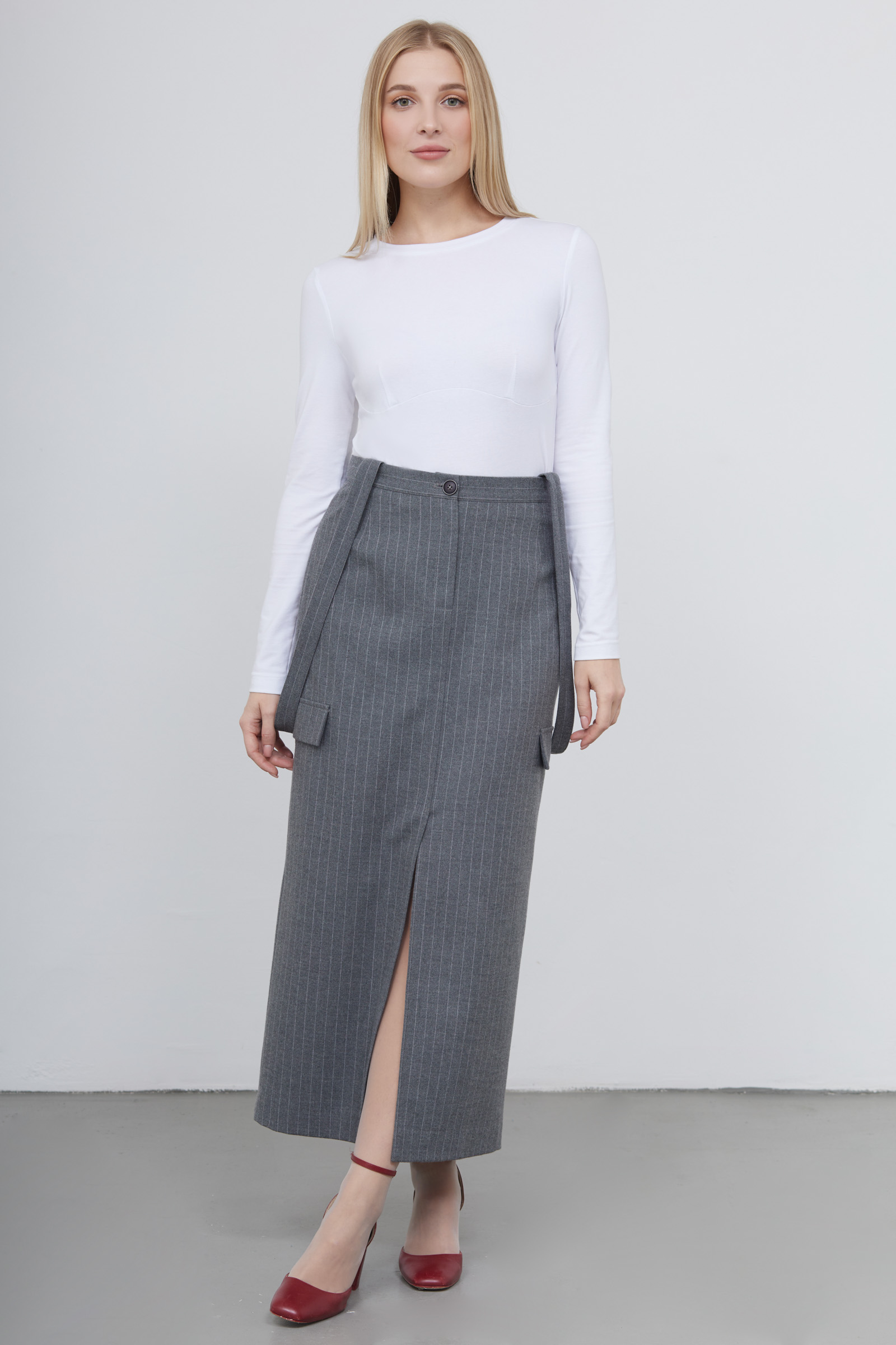 Длинная юбка карго в полоску из смесовой шерсти с разрезом и декоративными лямками.