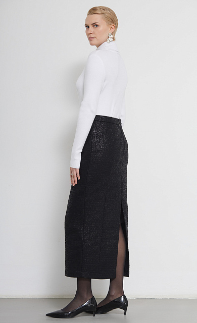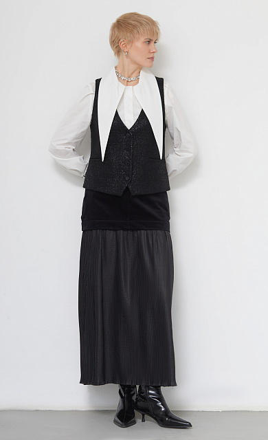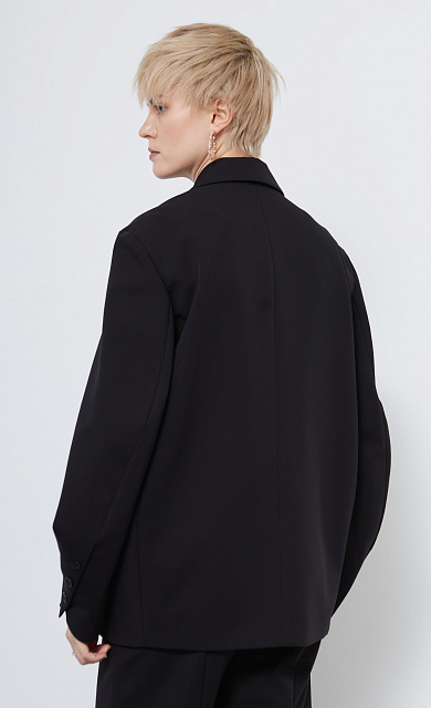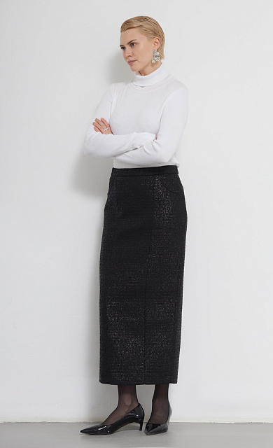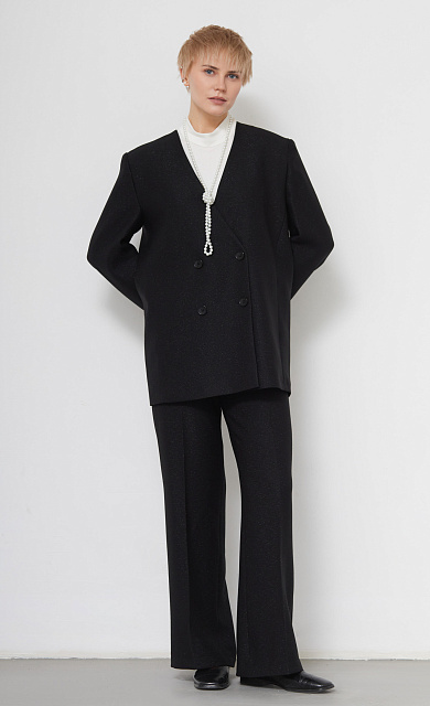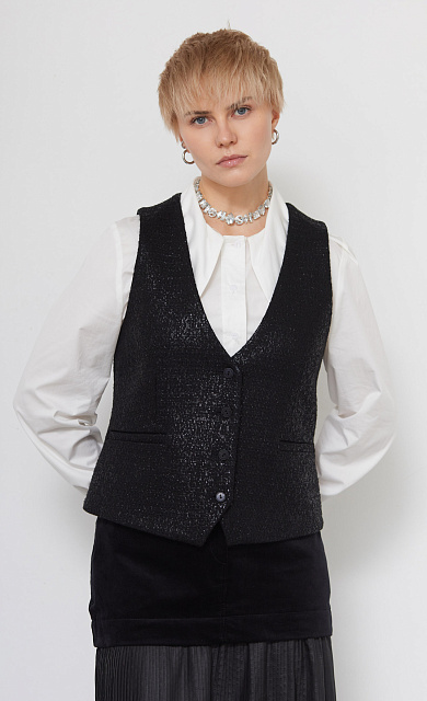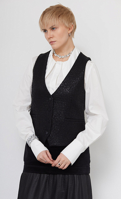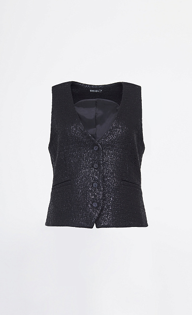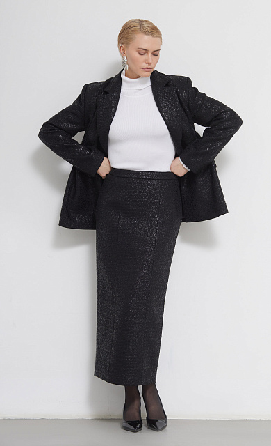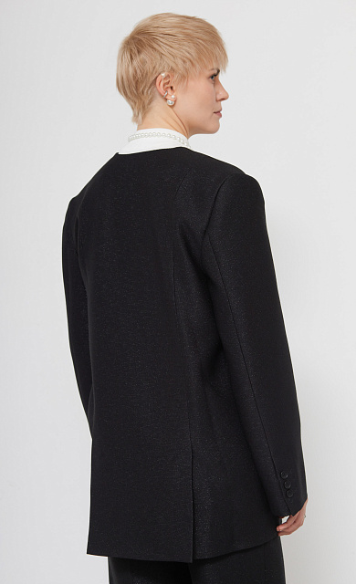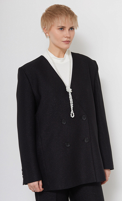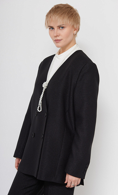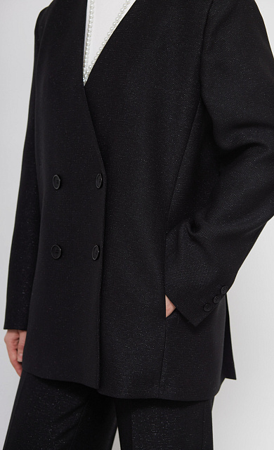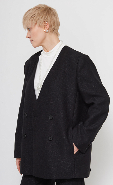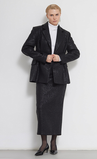 Двубортный жакет из твида с блестящим покрытием и акцентом на талии.