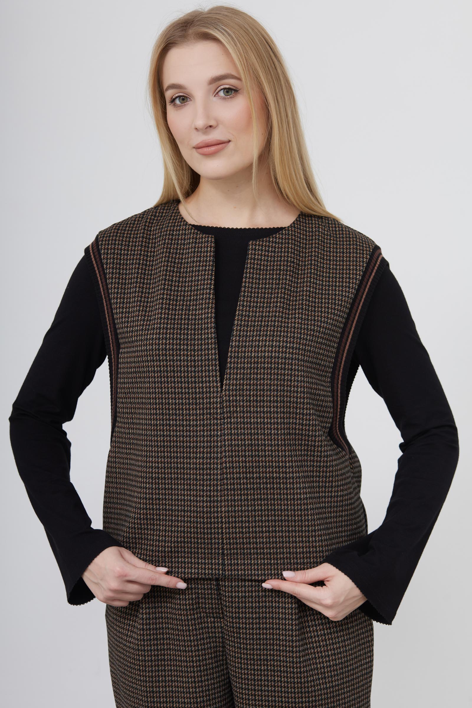Жилет oversize из мягкой фланелевой ткани с контрастным рисунком и широкими проймами.