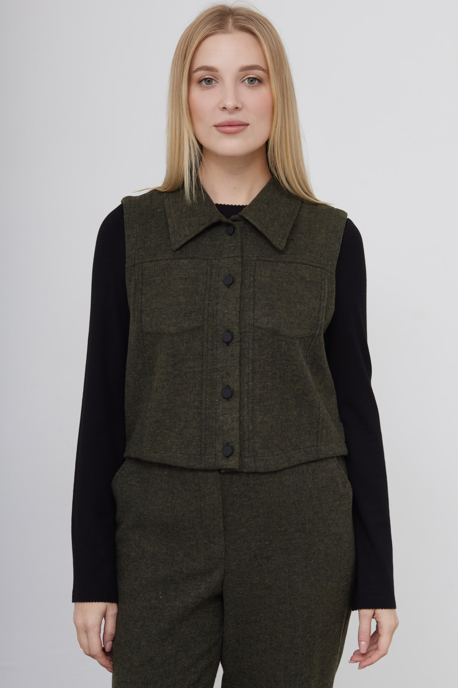 Укороченный жилет из мягкой костюмной ткани с шерстью.