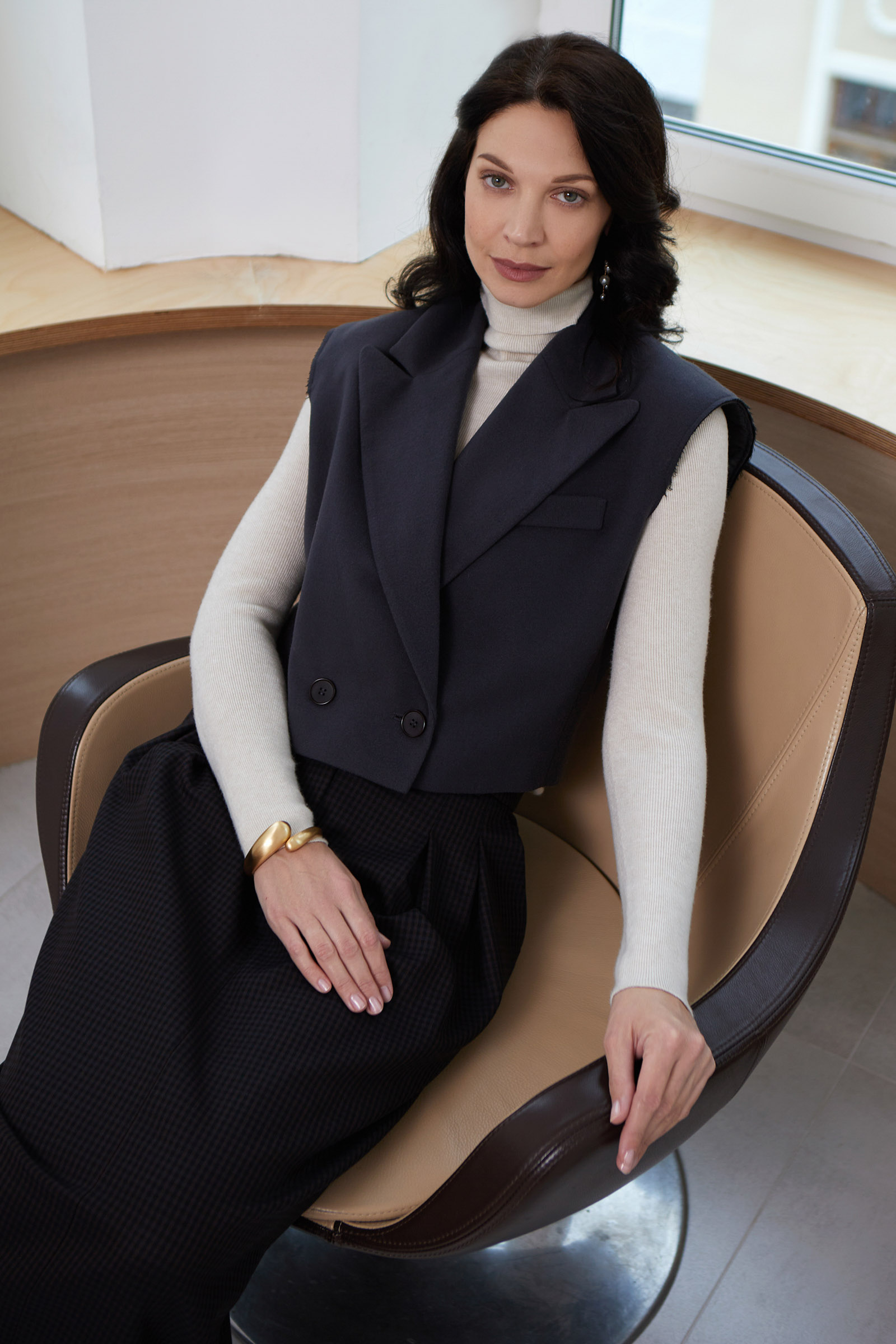 Укороченный костюмный жилет из поливискозы с мягкой фланелевой текстурой.