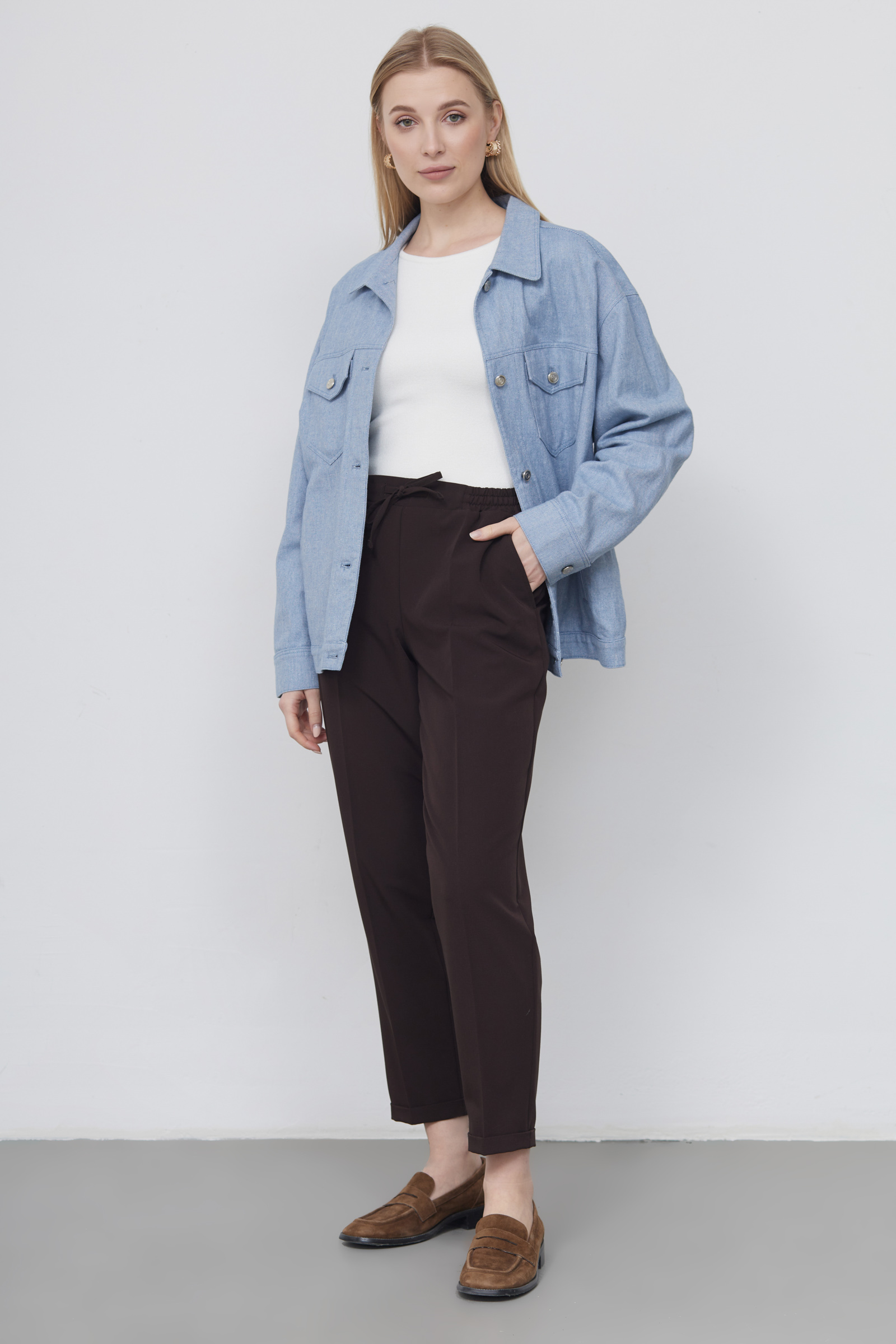 Классические зауженные брюки из поливискозы на эластичном поясе с кулиской.