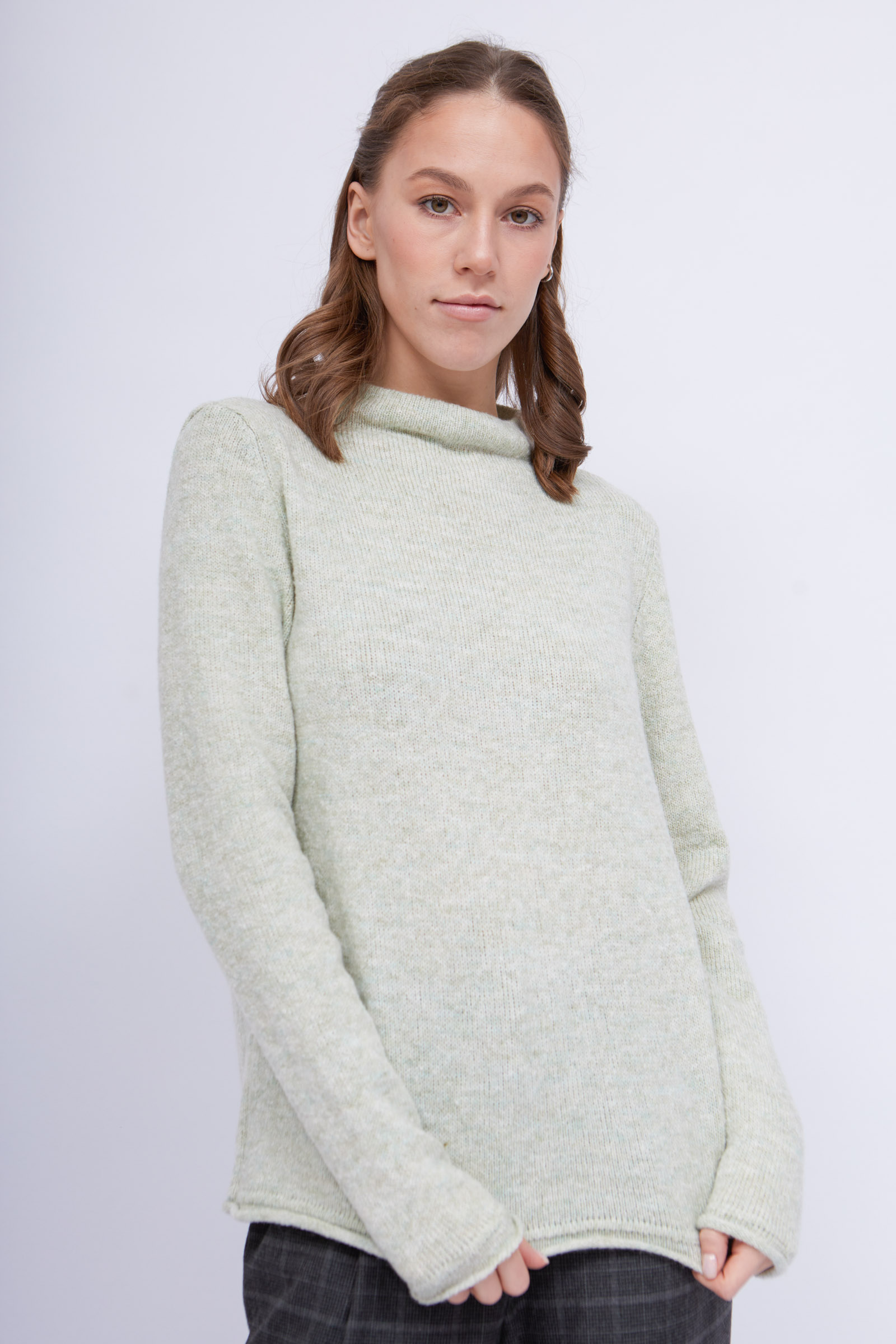 Джемпер из меланжевого трикотажа с необработанными краями.