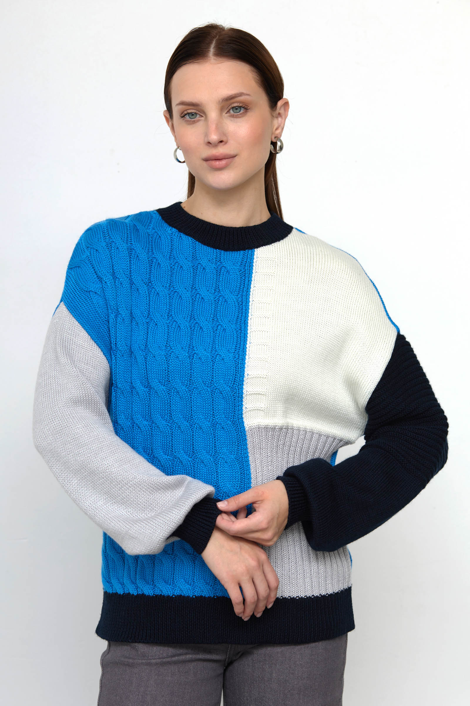 Джемпер колор-блок комбинированной вязки с шерстью.