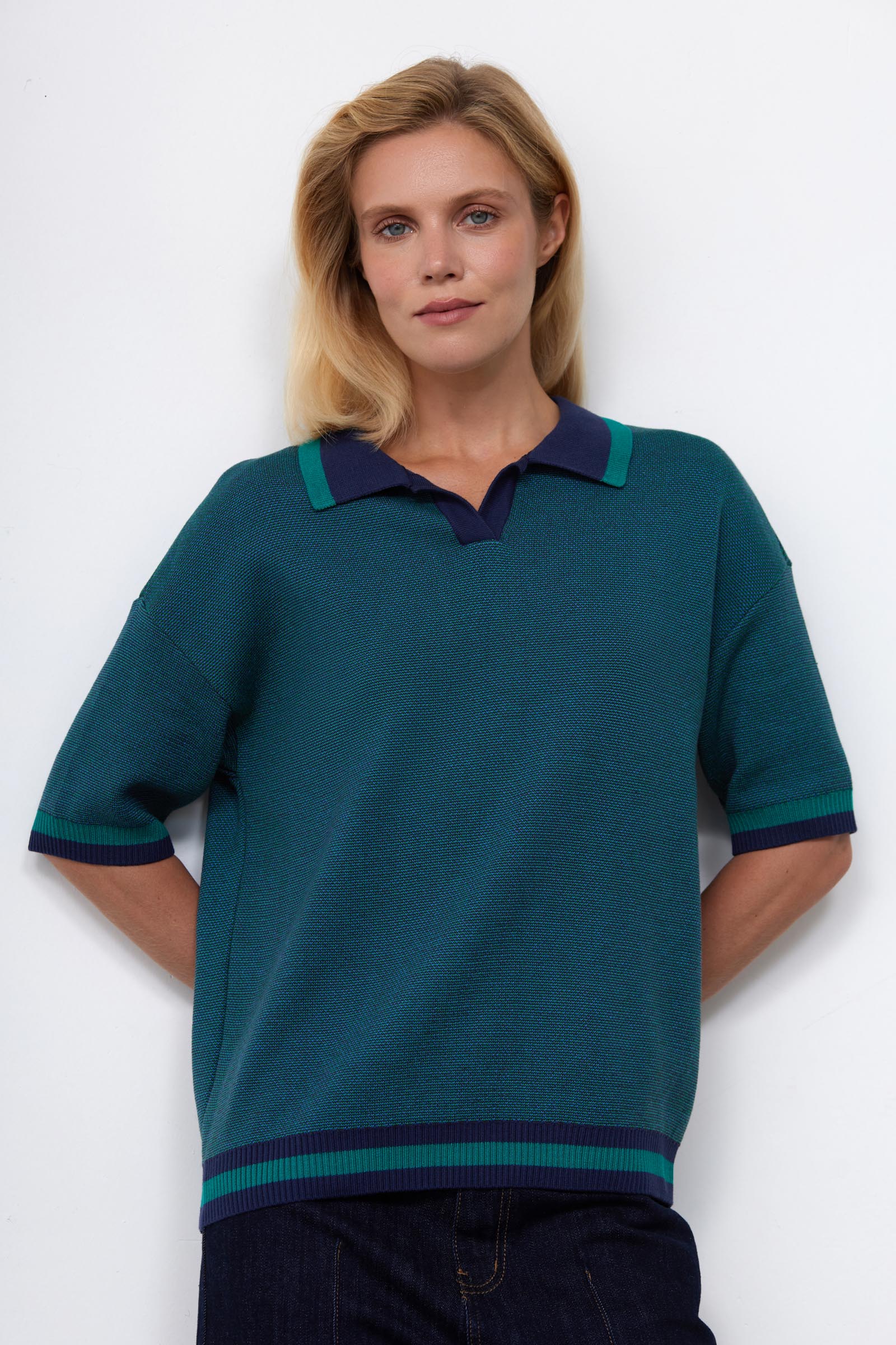 Джемпер поло из мягкого вязаного трикотажа с меланжевым эффектом и контрастным воротником.