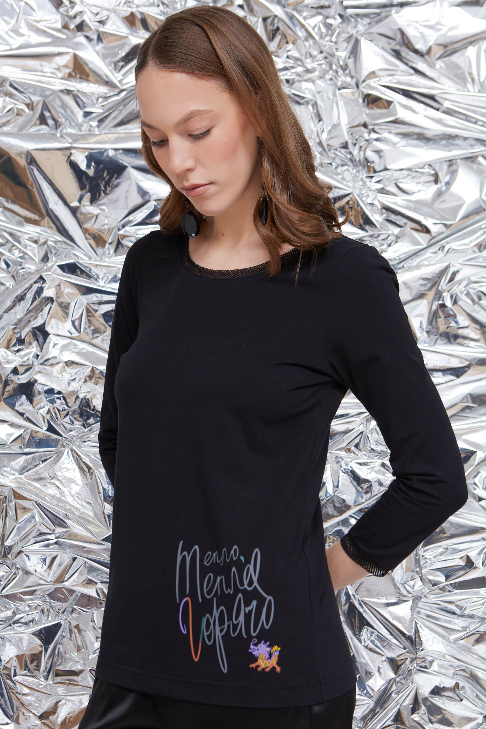 Лонгслив из вискозного трикотажа с отделкой из сетки и новогодним печатным принтом.
