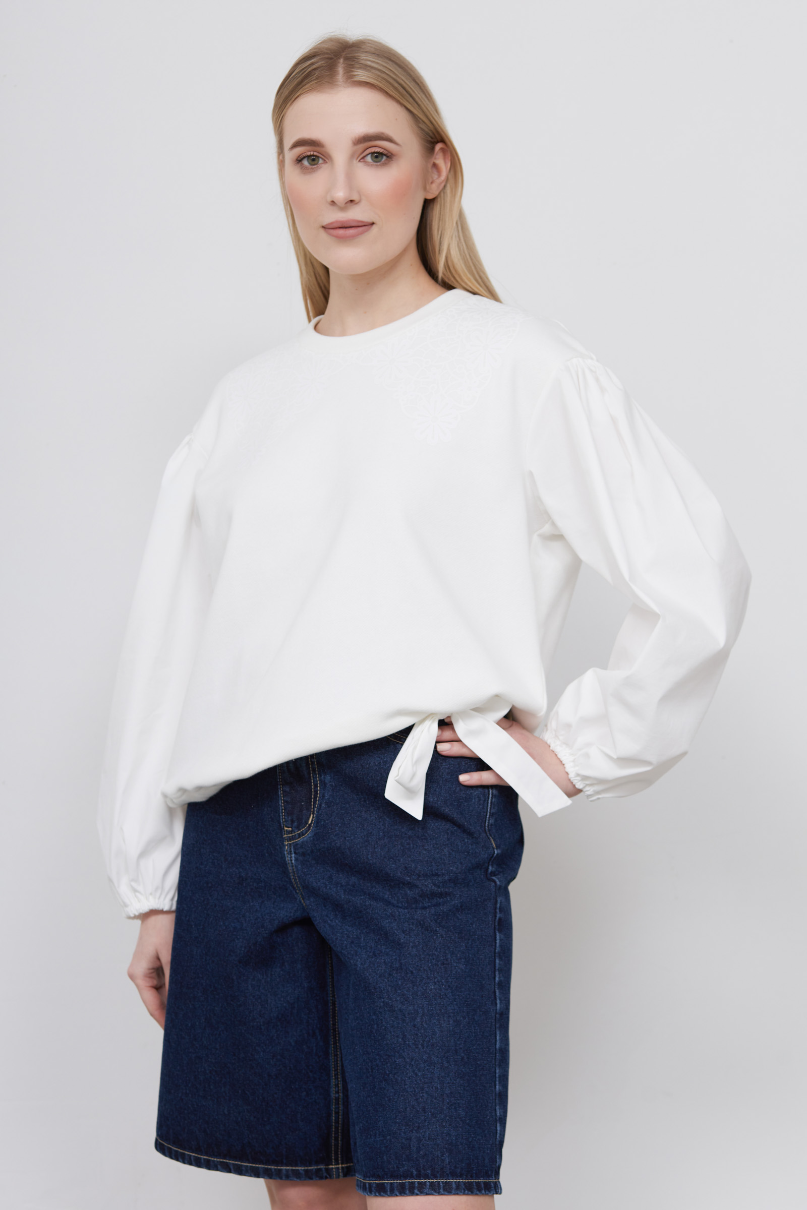 Комбинированный свитшот из футера с рукавами буфами из хлопка, печатным принтом в виде кружевного воротника и завязками по низу.