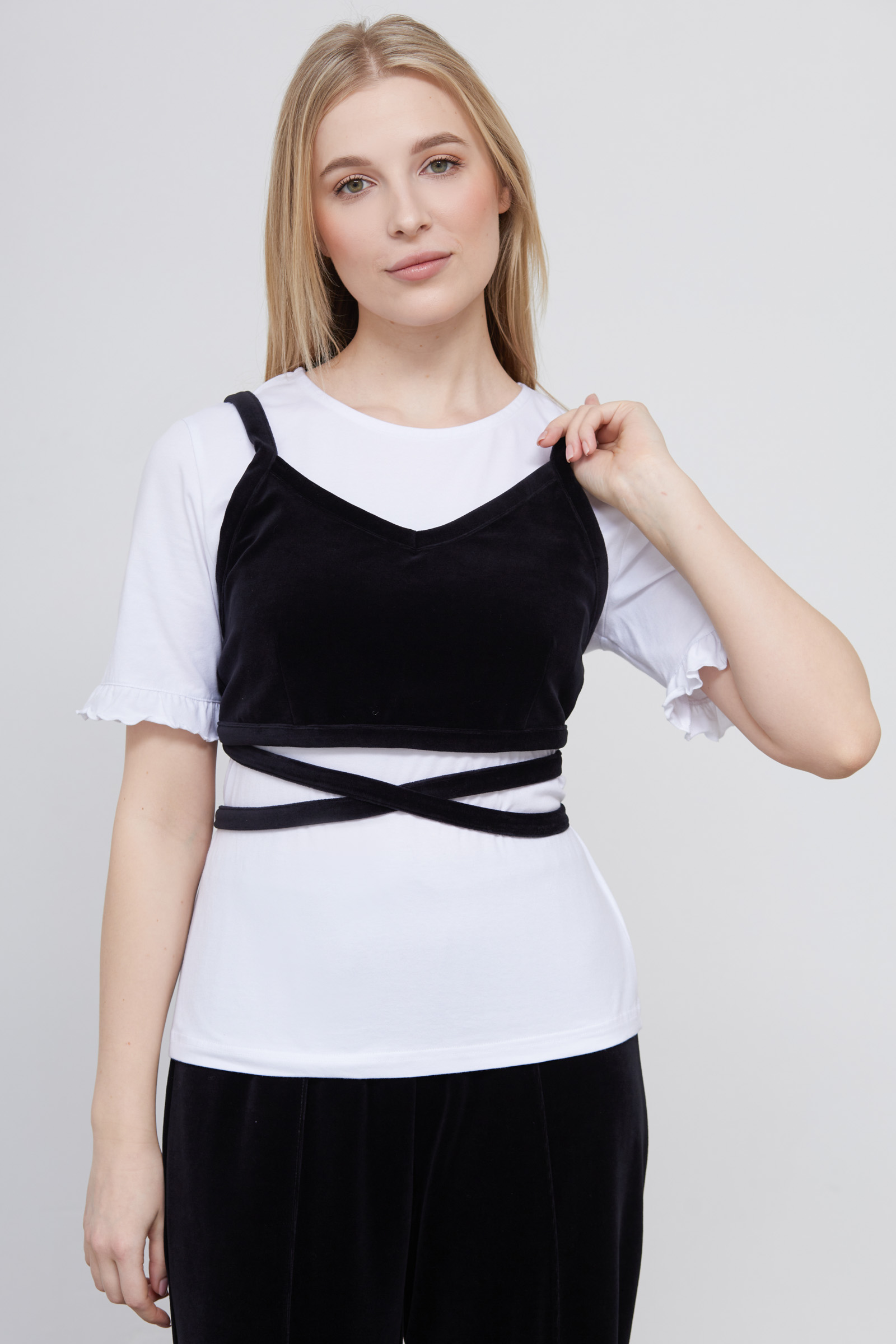 Бархатный топ на бретелях с длинными завязками.
