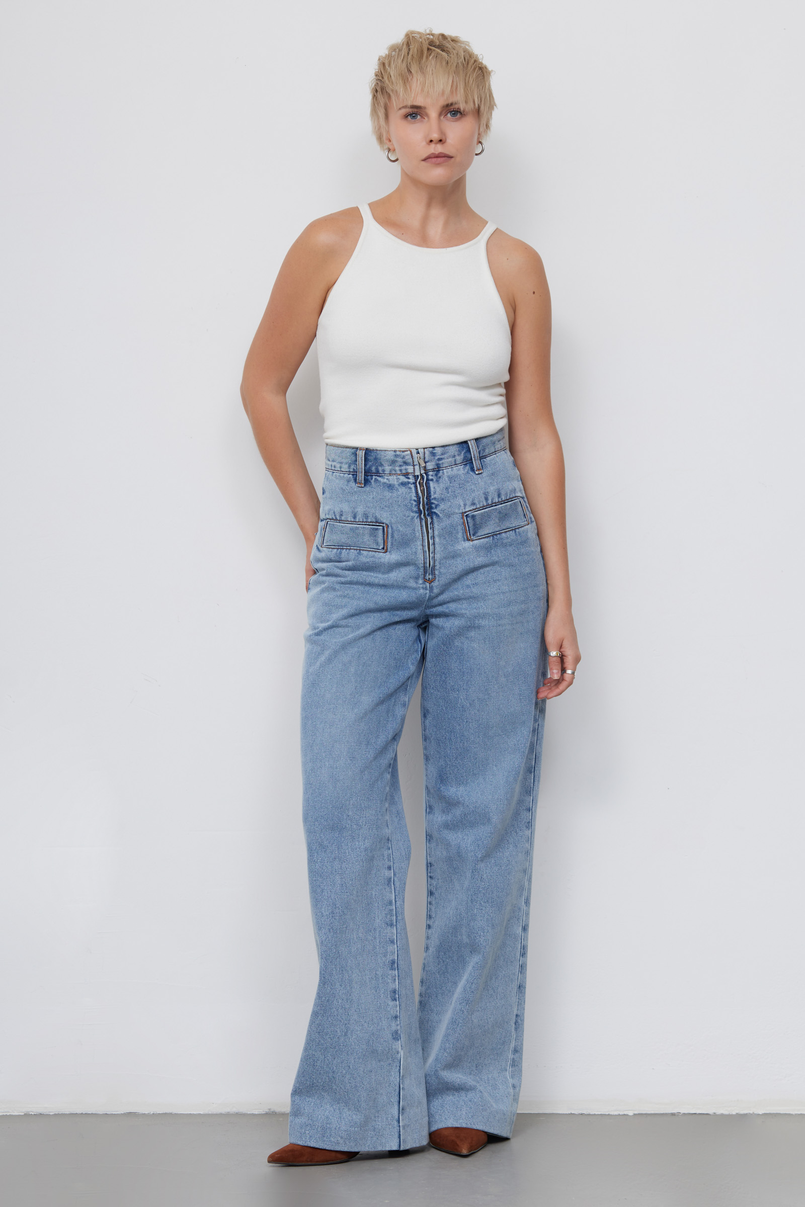 Широкие джинсы из плотного денима с акцентными карманами и открытой молнией.