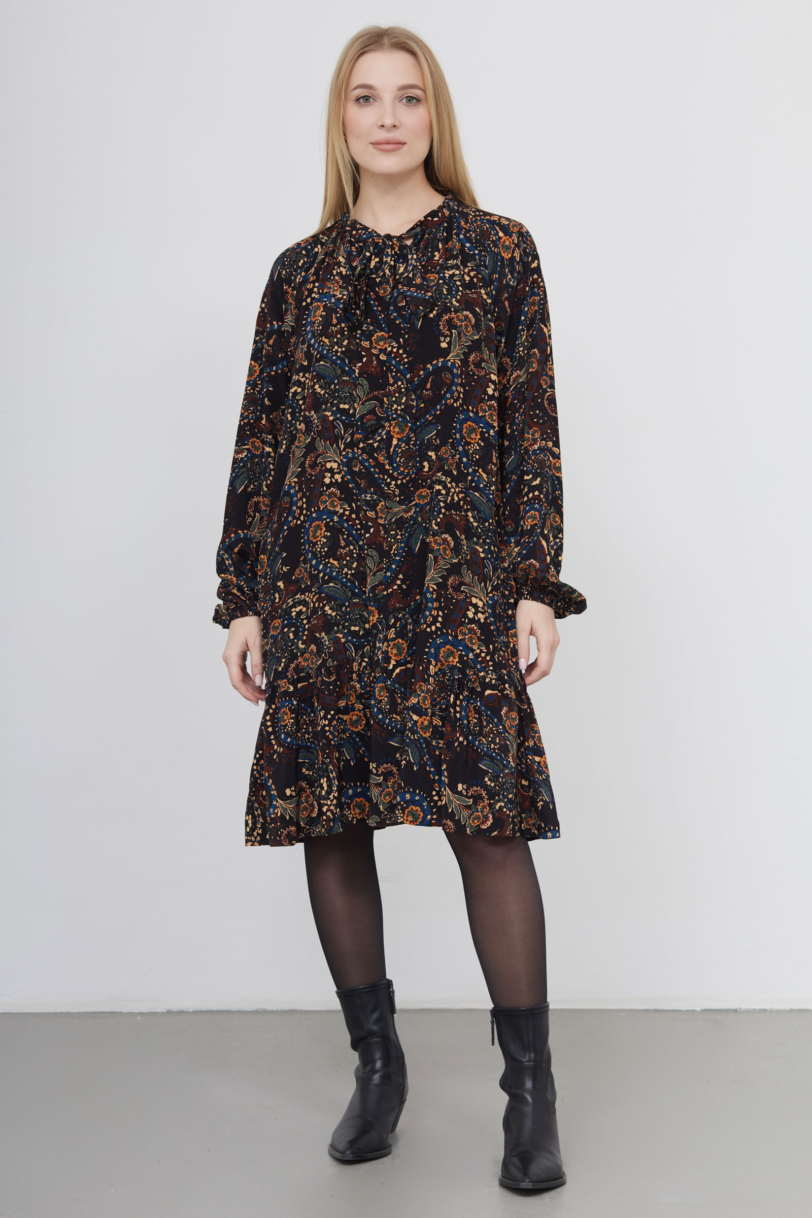 Короткое платье oversize из вискозы с принтом пейсли, воланом и воротником аскот.