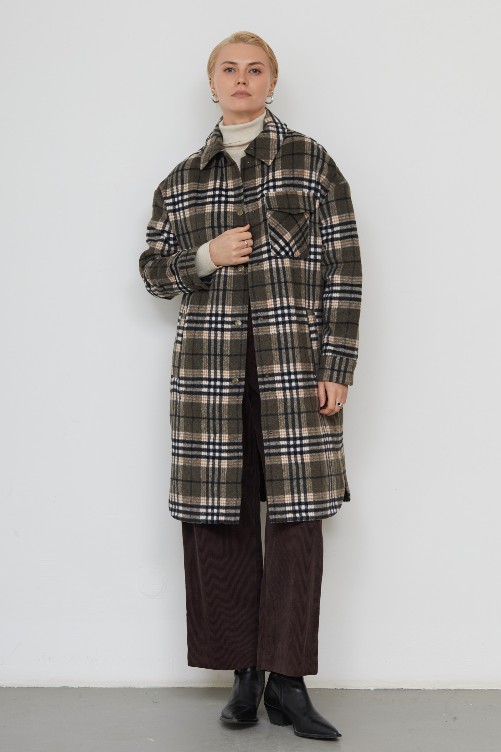 Пальто-рубашка oversize в клетку на кнопках.