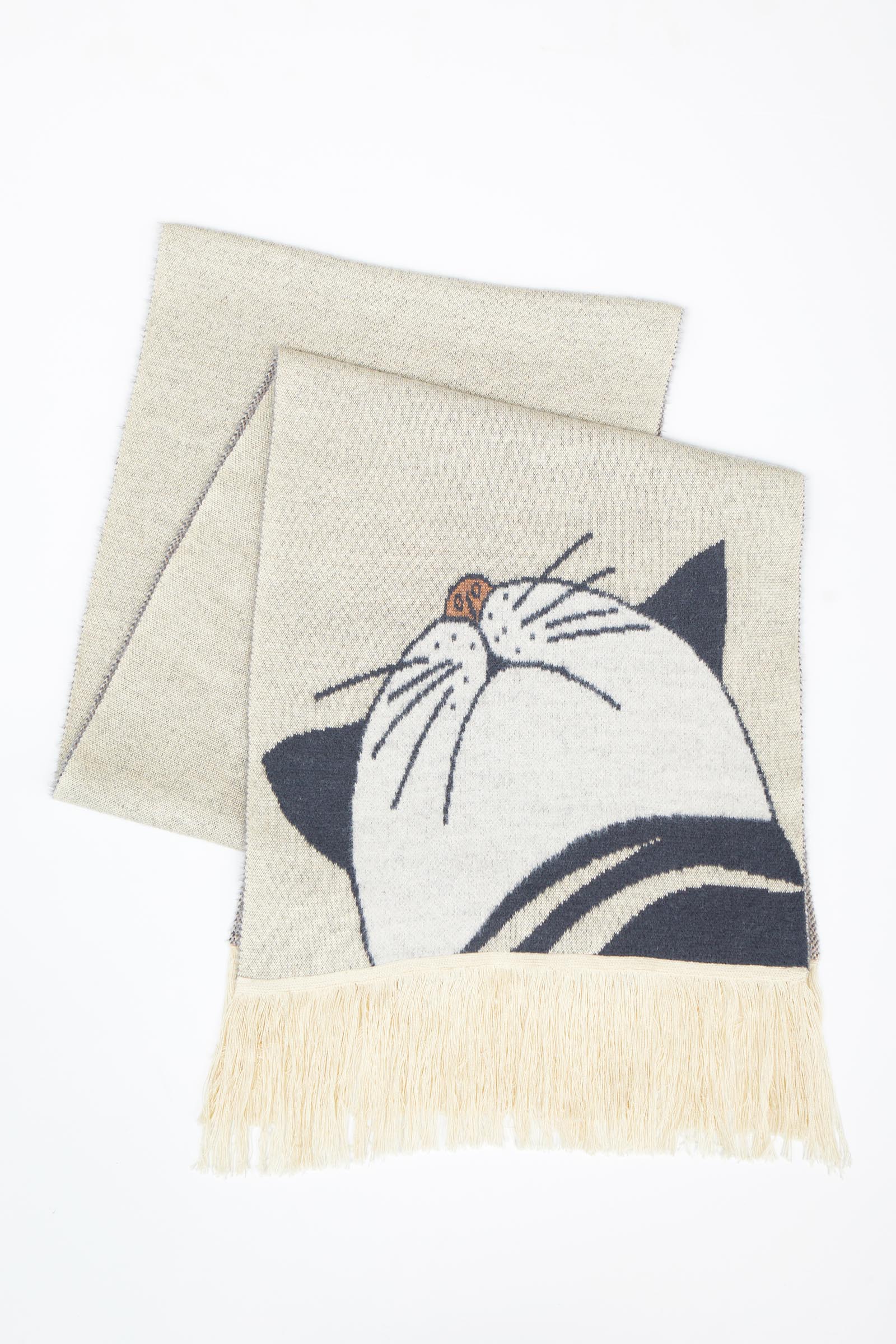 Длинный широкий шарф из пушистого трикотажа жаккардовой вязки с рисунком и бахромой.