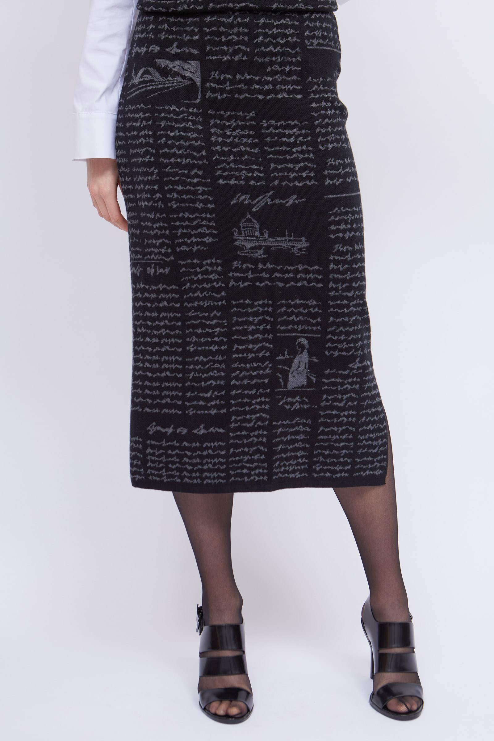 Юбка миди жаккардовой вязки с разрезом сбоку.