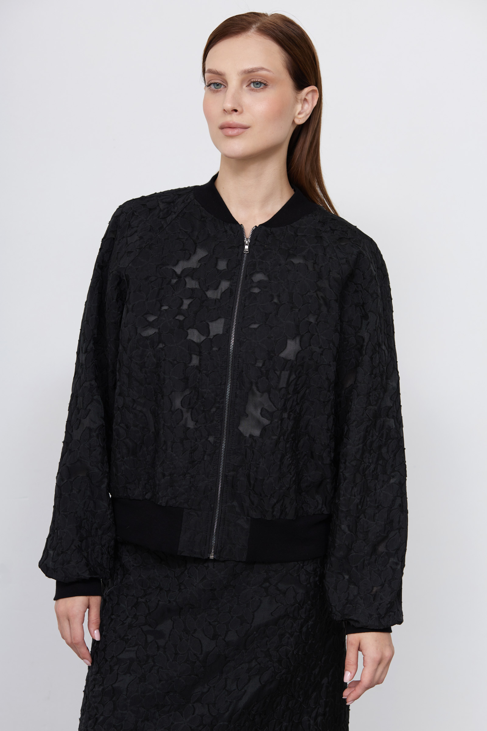 Куртка-бомбер из органзы с цветочной аппликацией.