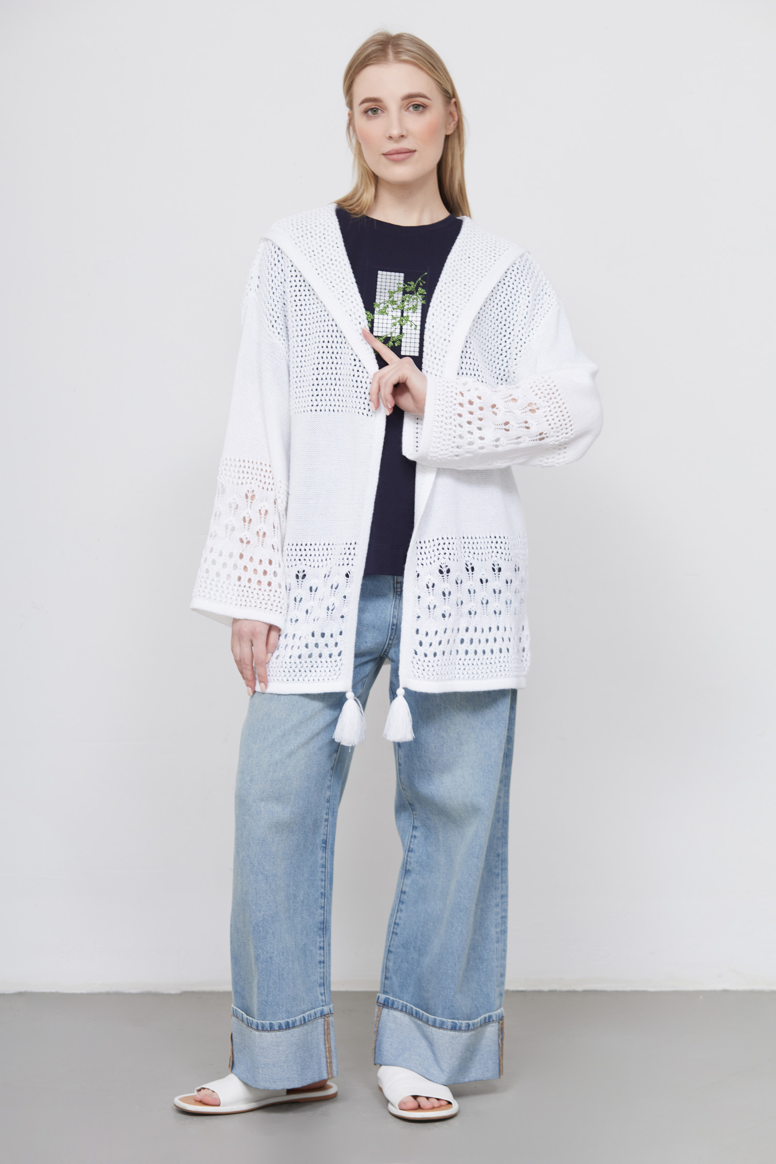 Удлиненный кардиган oversize ажурной вязки с капюшоном и декором.