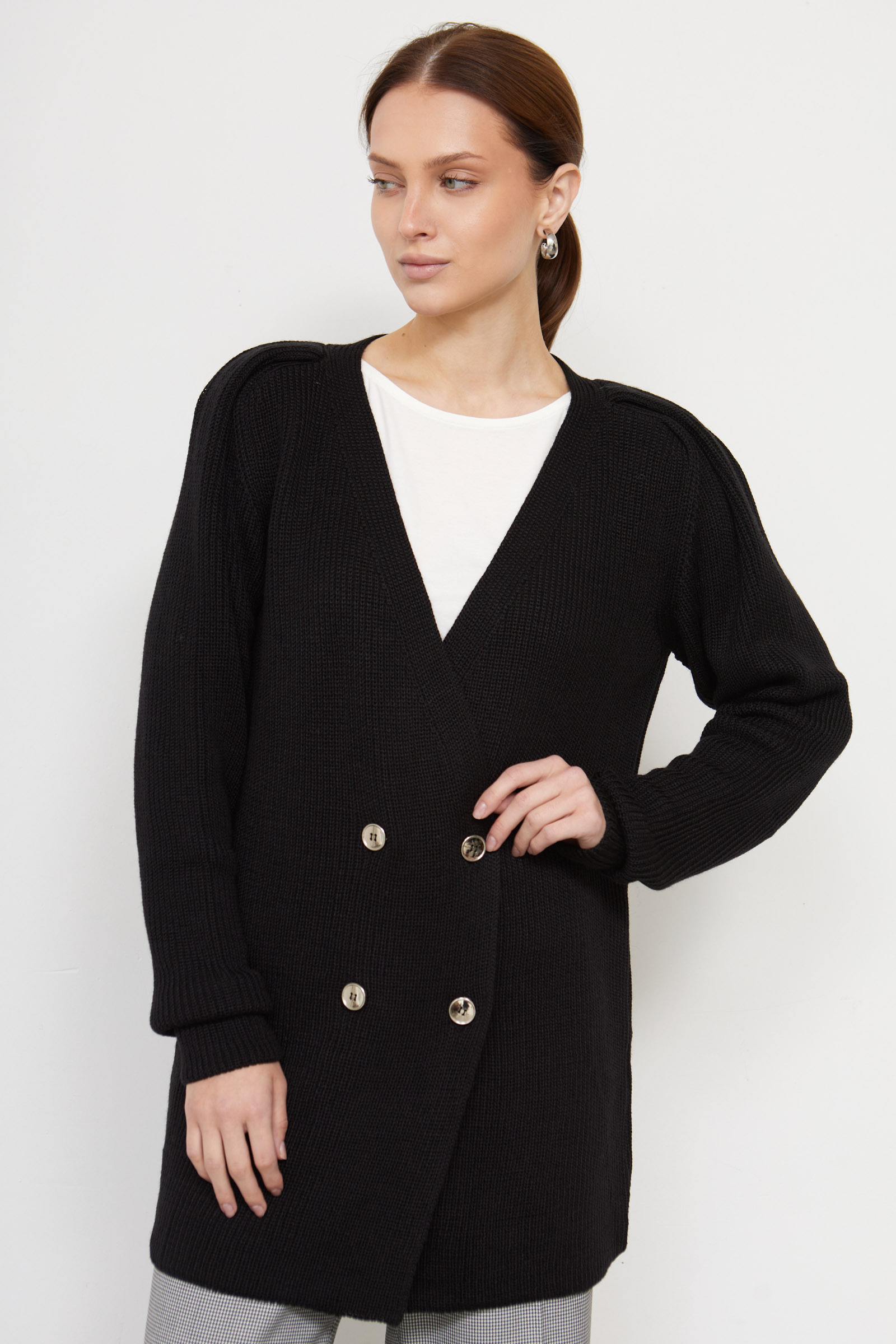 Кардиган из смесовой шерсти с двубортной застежкой и акцентными плечами.
