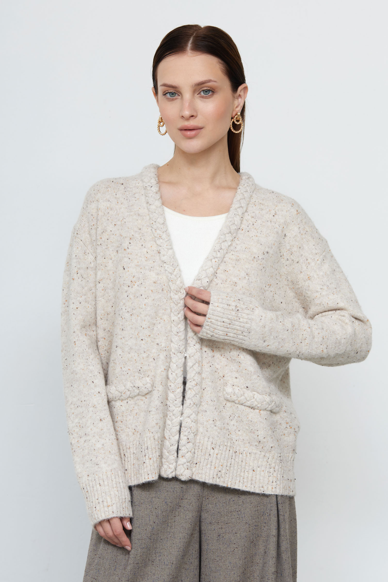 Кардиган из меланжевой пряжи с шерстью и декором в форме косичек.