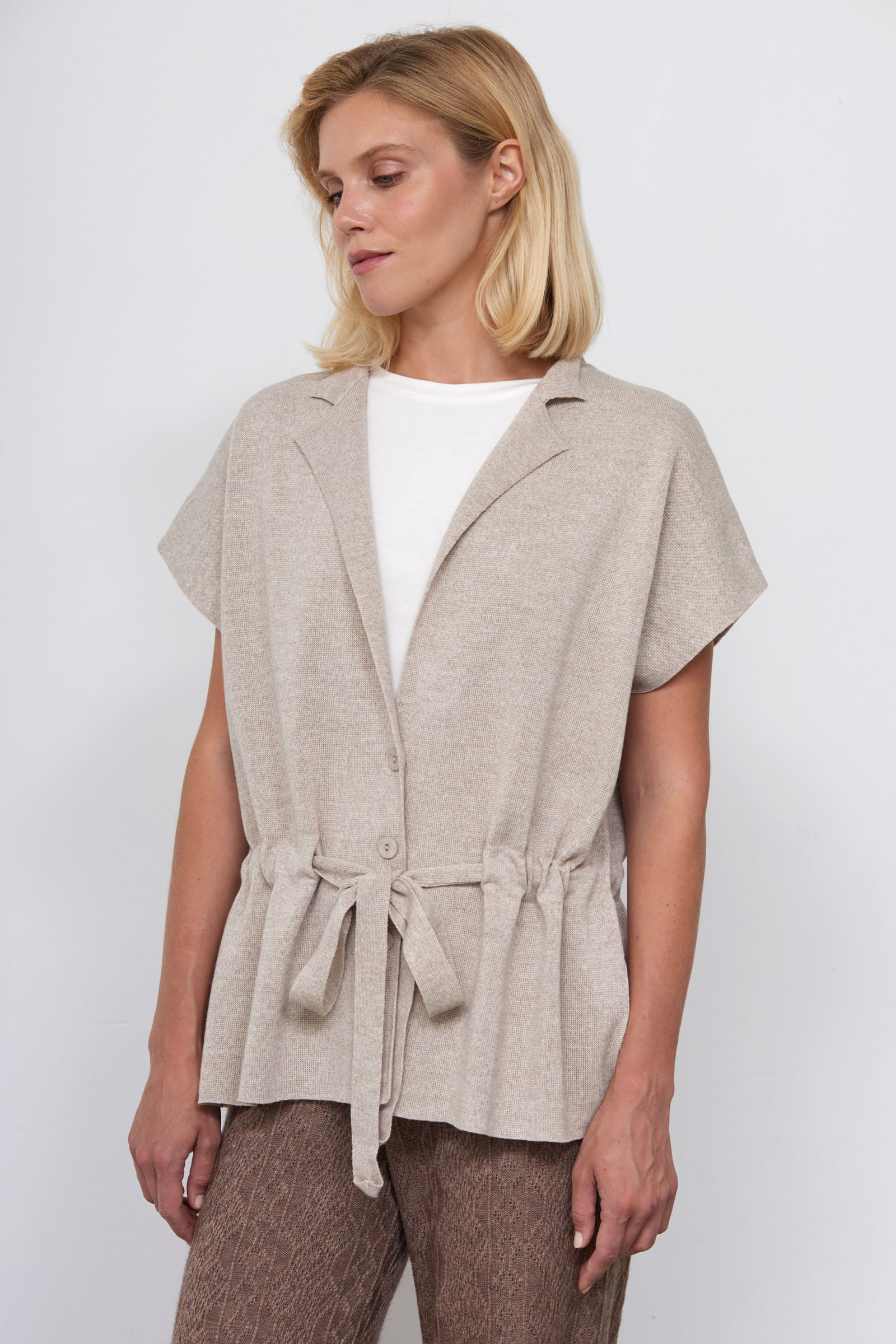 Жилет из вязаного полушерстяного трикотажа на пуговицах и с кулиской на поясе.