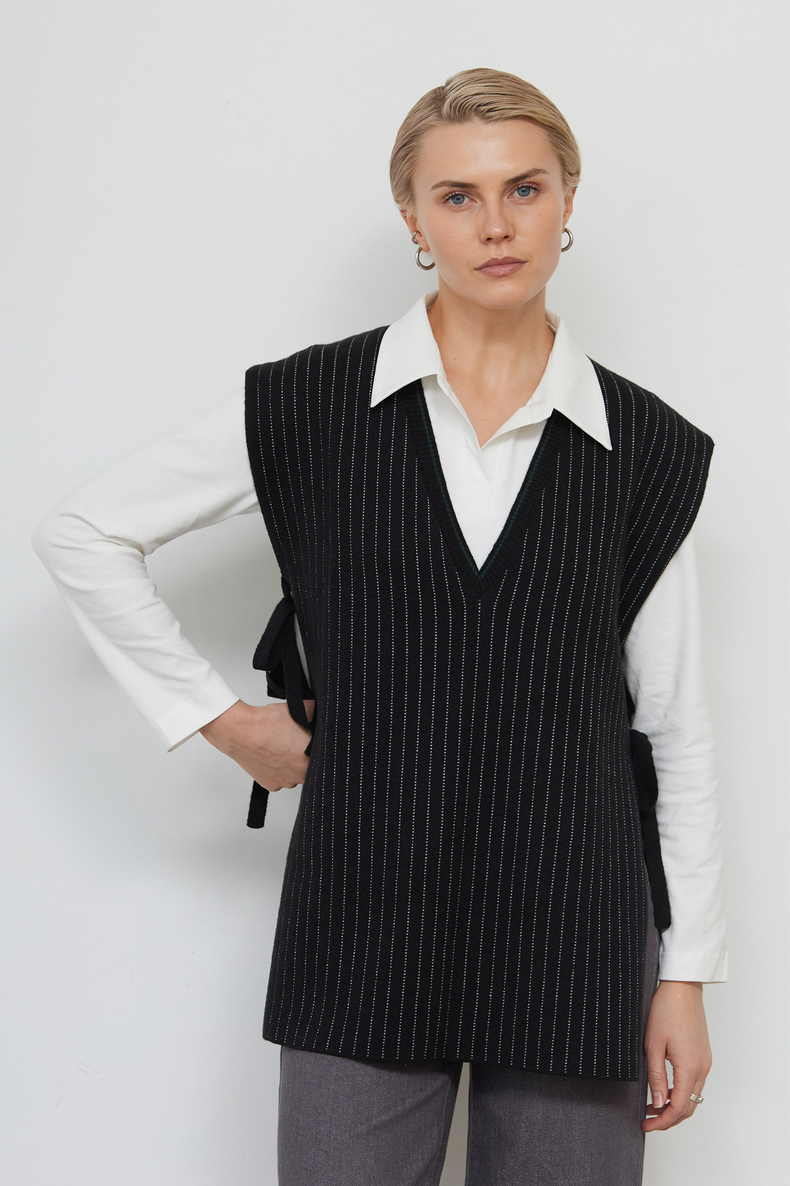 Удлиненный жилет oversize жаккардовой вязки в полоску с завязками по бокам.